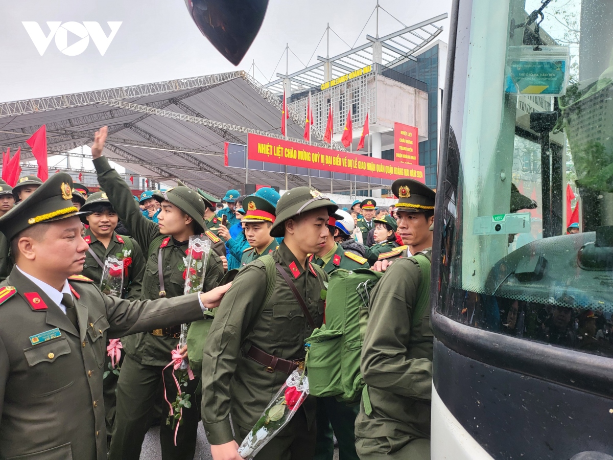 Người thân đến chúc mừng các tân binh CAND lên đường nhập ngũ. Ảnh: Việt Cường/VOV1 |