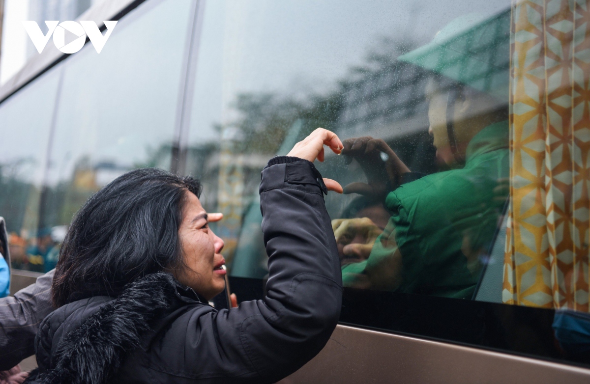 Tân binh chào người thân trước khi lên xe về đơn vị huấn luyện. Ảnh: Việt Cường/VOV1 |