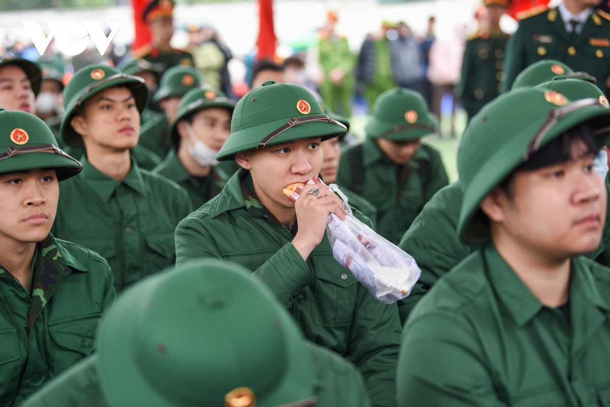 Một số tân binh dậy từ sớm để chuẩn bị vẫn chưa kịp ăn sáng nên tranh thủ ăn khi đã ngồi trong hàng ngũ. |