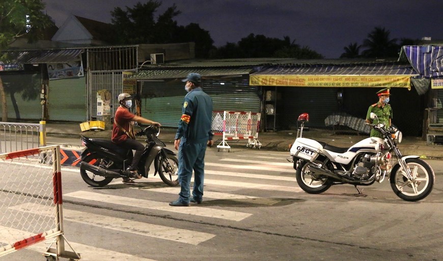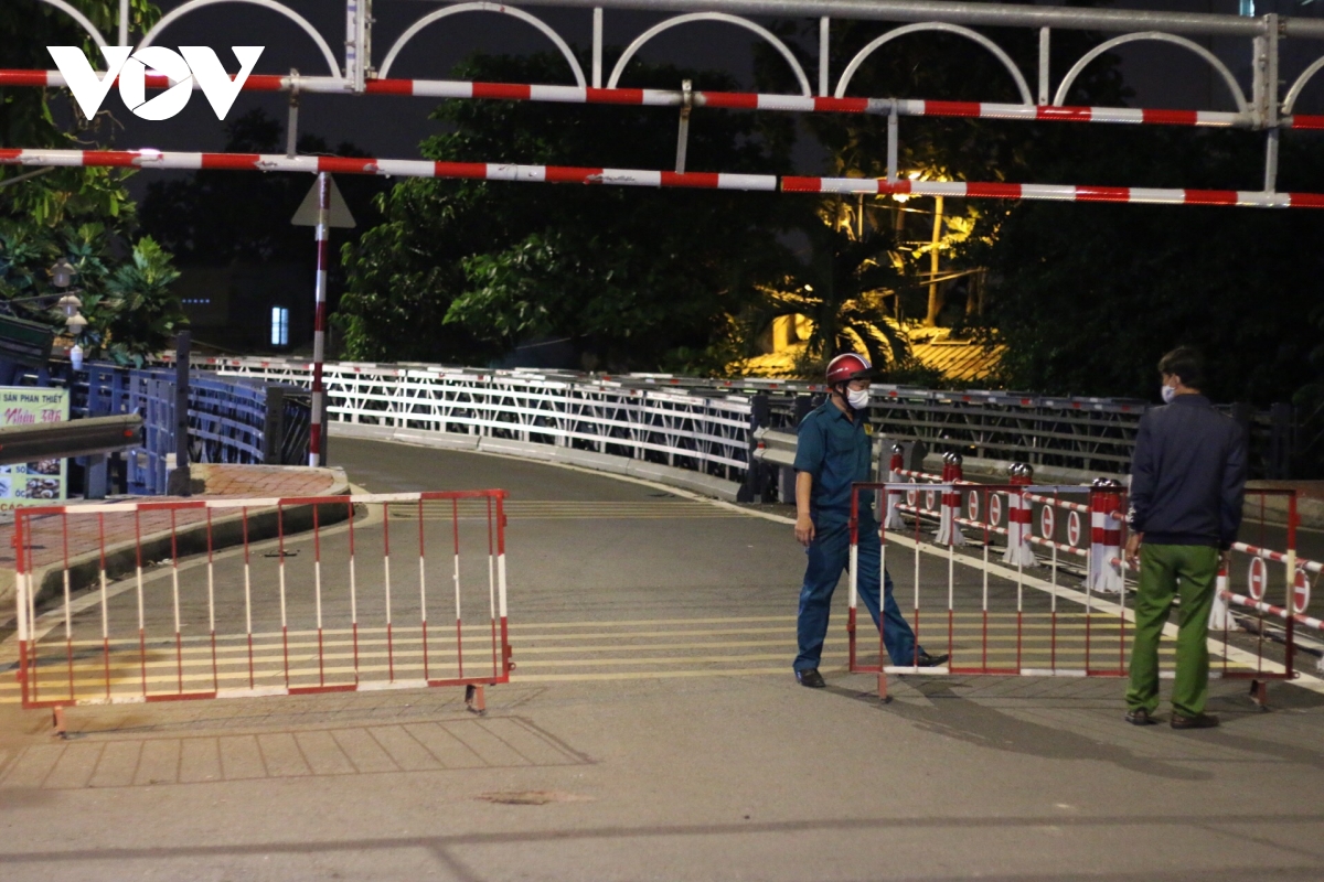 Lực lượng chức năng lập chốt kiểm soát lưu thông tại khu vực cầu Trường Đai giữa phường Thới An, quận 12 với phường 13, quận Gò Vấp. Ảnh: Xuân Tình/TTXVN