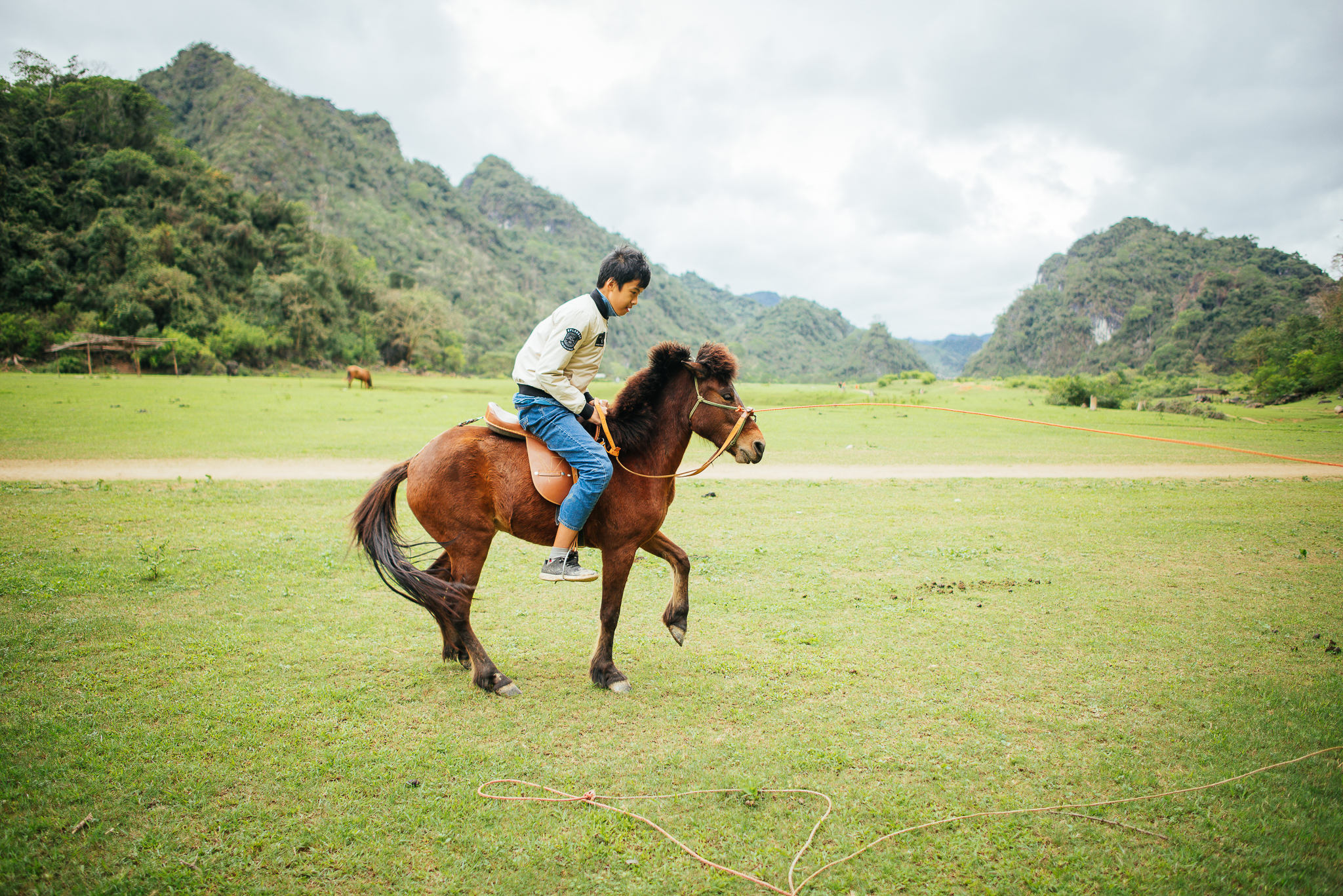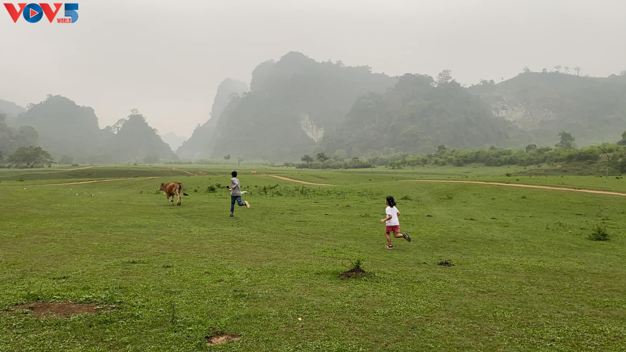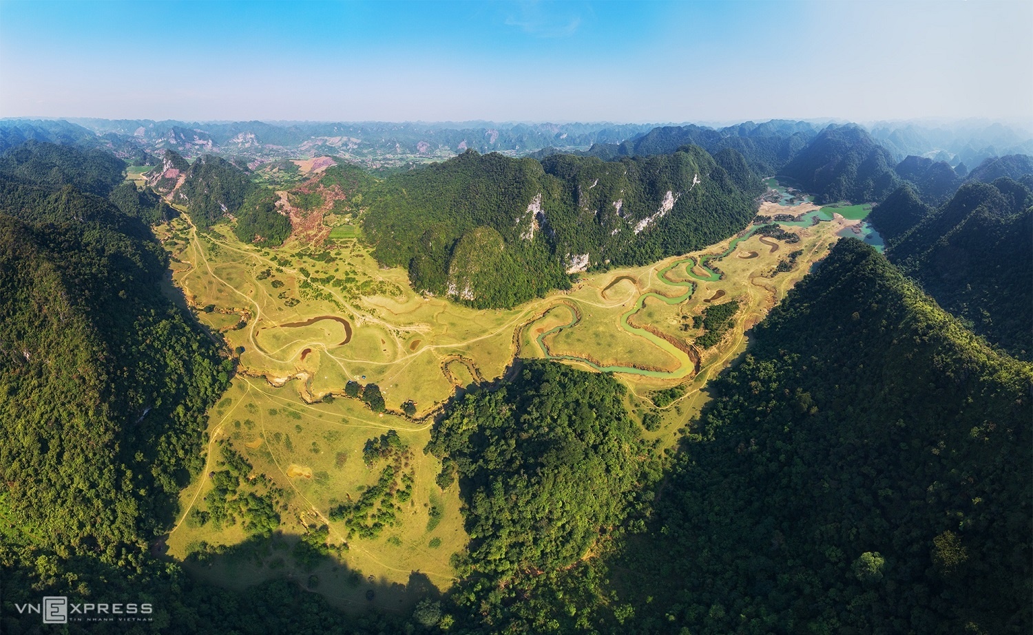 Thảo nguyên Đồng Lâm rộng đến 100 ha với cảnh đẹp sơn thủy hữu tình. Trên núi có hang, dưới có cánh đồng cỏ xanh ngút ngàn và dòng suối nước xanh ngọc uốn lượn chảy qua. Ảnh: Bùi Vinh Thuận/VNExpress |