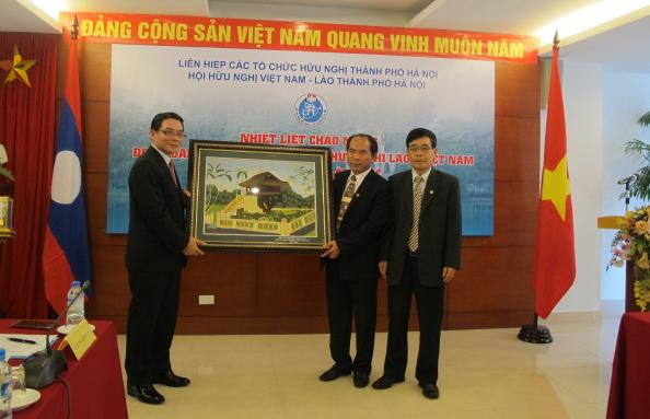 | Hội hữu nghị Việt Nam - Lào tặng quà lưu niệm cho ông Villayvong Boudakham, Chủ tịch TW Hội hữu nghị Lào- Việt Nam |