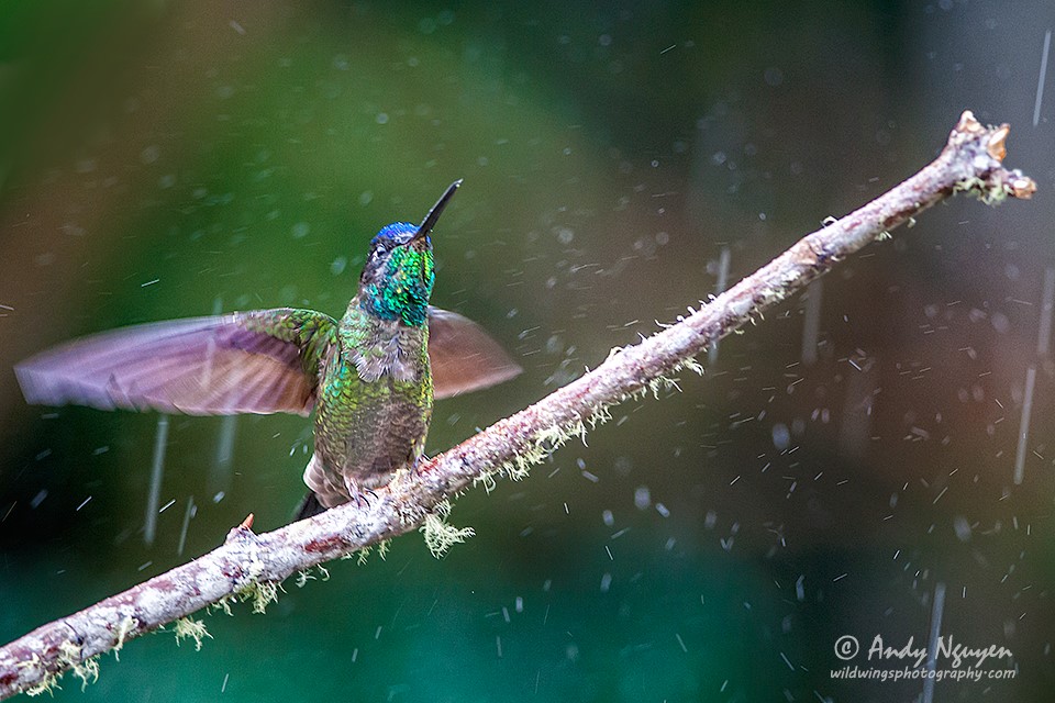 | Bức ảnh có tên "Tắm mưa:. Trong khi hầu hết các con chim khác đều tìm về tổ ấm chờ mưa tạnh thì chú chim ruồi của xứ sở Trung Mỹ lại thích tắm mưa. Ảnh: Andy Nguyễn |