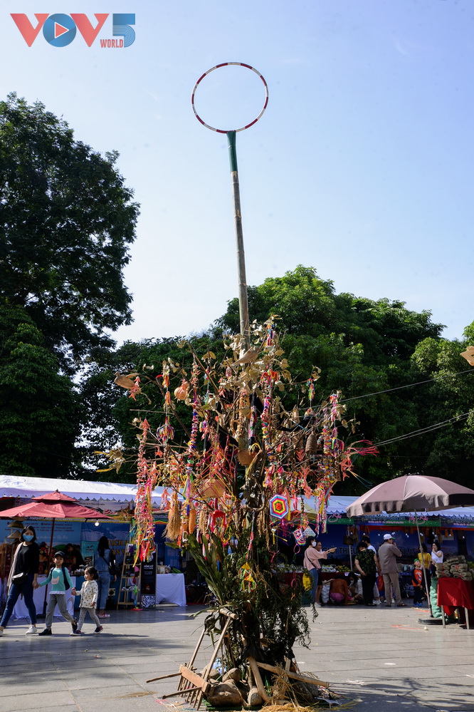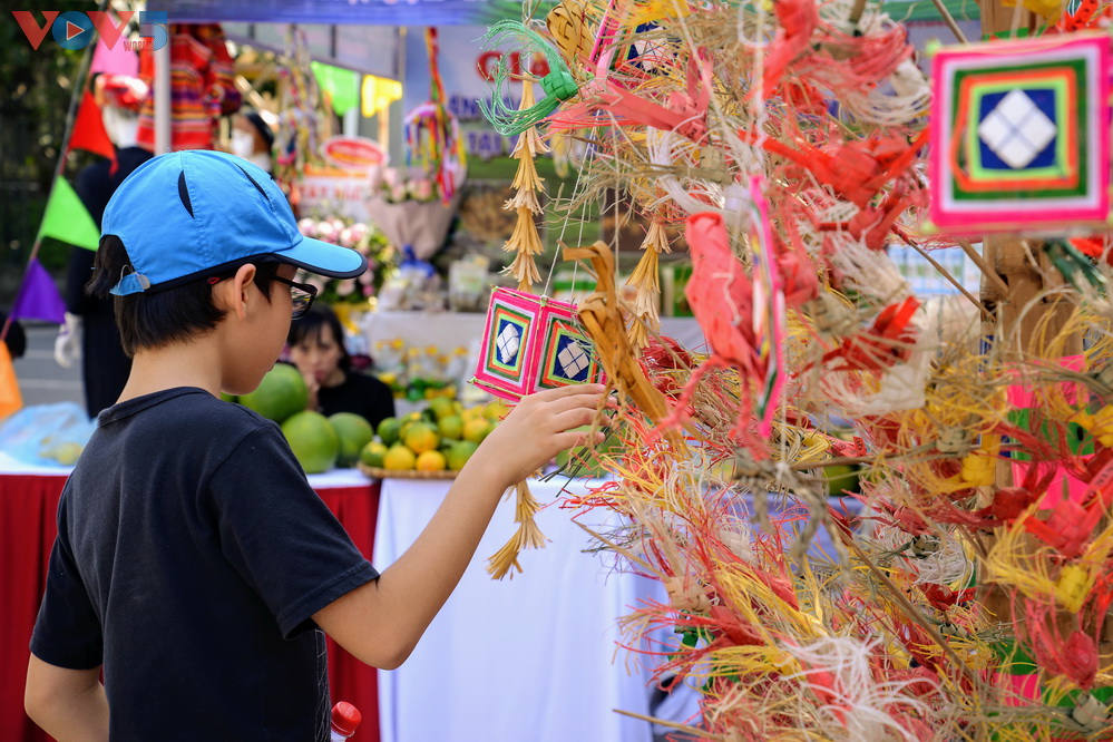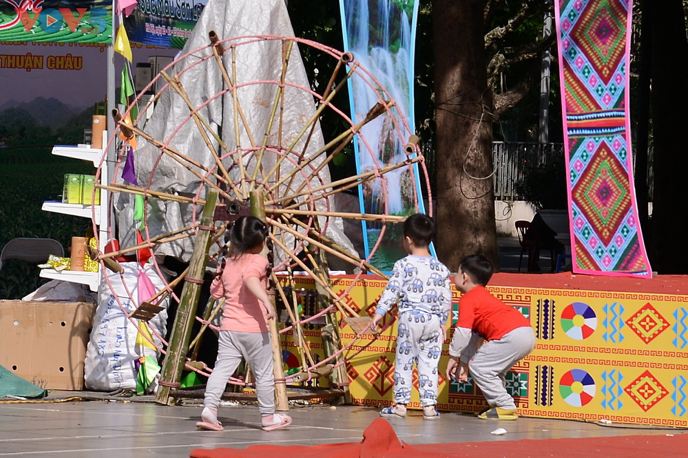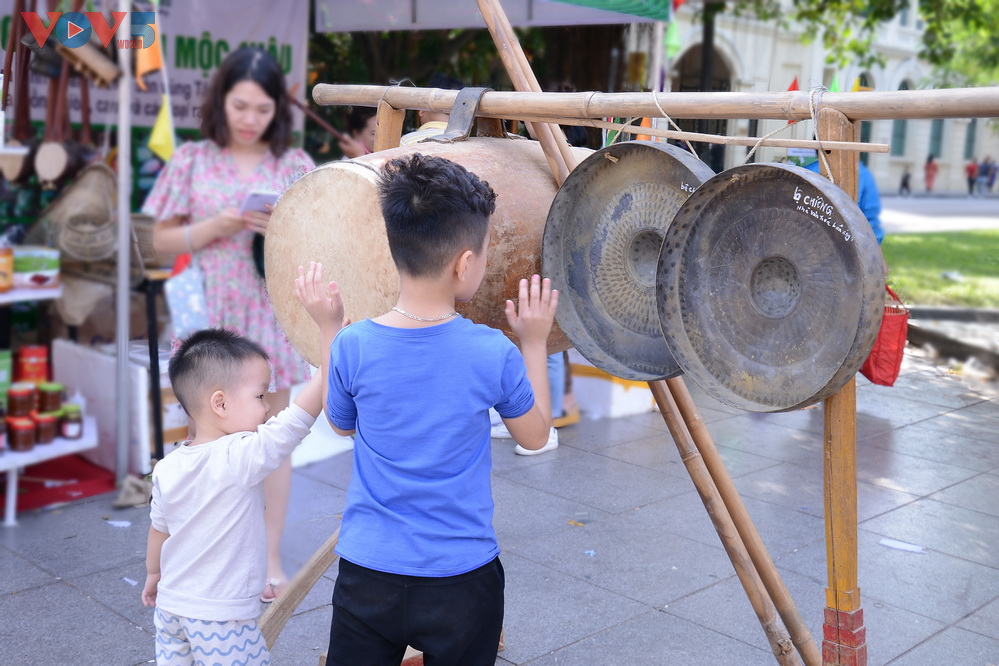 | Những mô hình Cọn Nước (bánh xe nước), Cây Nêu hay những nhạc cụ dân tộc như trống da trâu, chiêng đồng... thu hút sự tò mò của các em nhỏ |