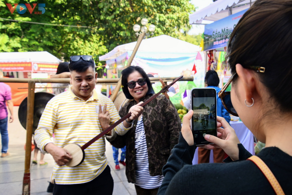 | Hai du khách lưu lại khoảnh khắc thú vị khi được học cách chơi Đàn Tính, một nhạc cụ tiêu biểu của đồng bào dân tộc Tày, Nùng, Thái nói chung. |