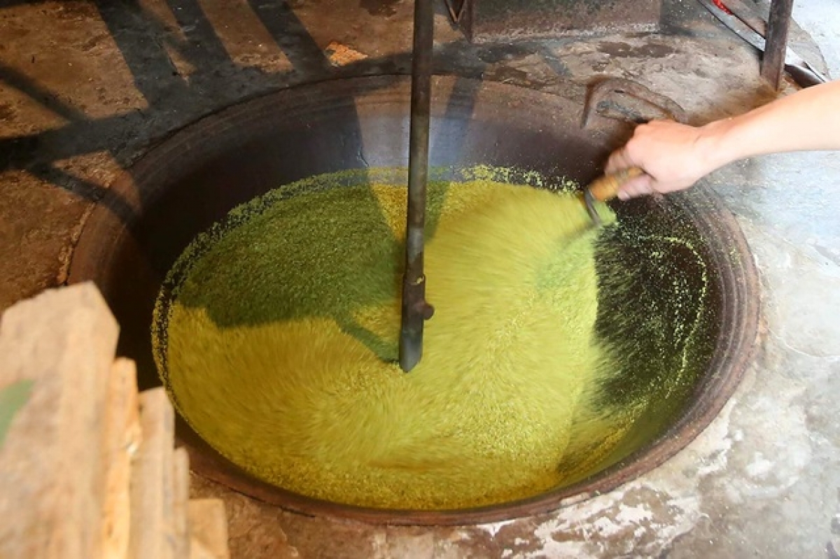 Thóc nếp non sau khi đem về phải được đãi sạch rồi cho vào chảo gang đúc để rang. Đây là công đoạn đòi hỏi người thợ phải đảo thóc, căn lửa thật chuẩn vì chỉ sai một quy trình thì cả mẻ cốm sẽ đi tong.
