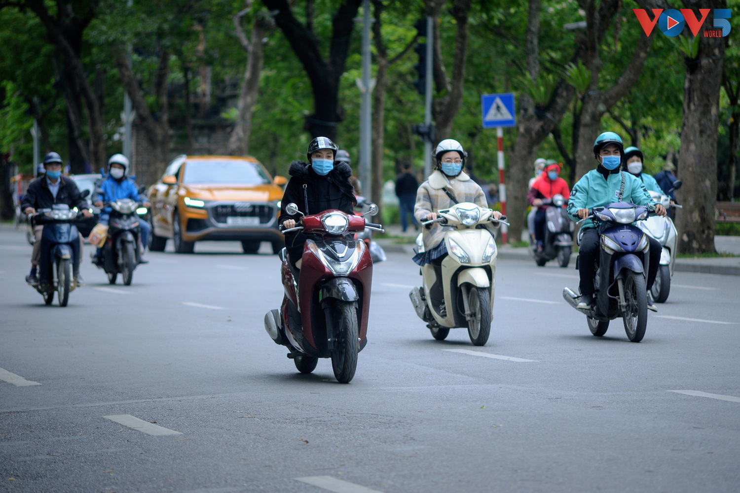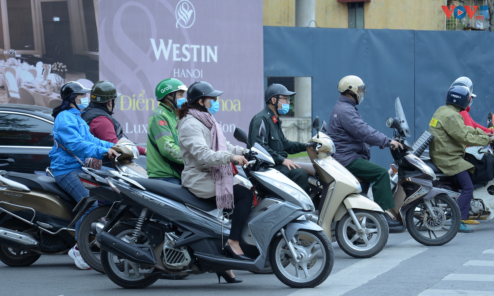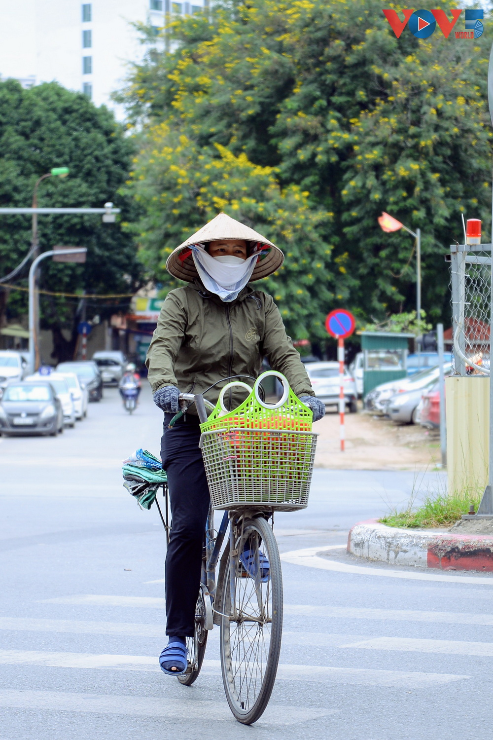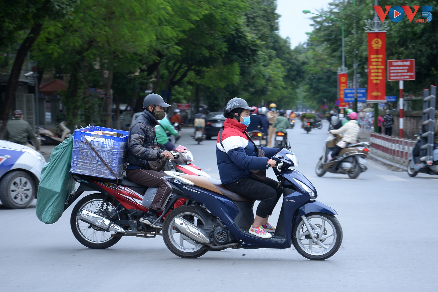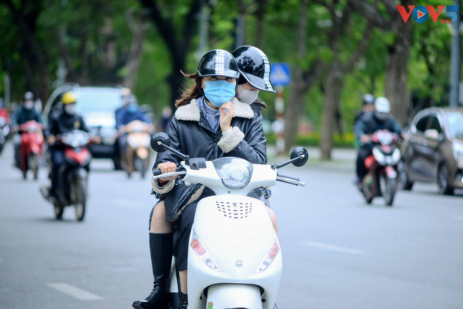 | 8 giờ sáng, nhiều người phải khoác thêm áo mưa để tránh gió lạnh. |