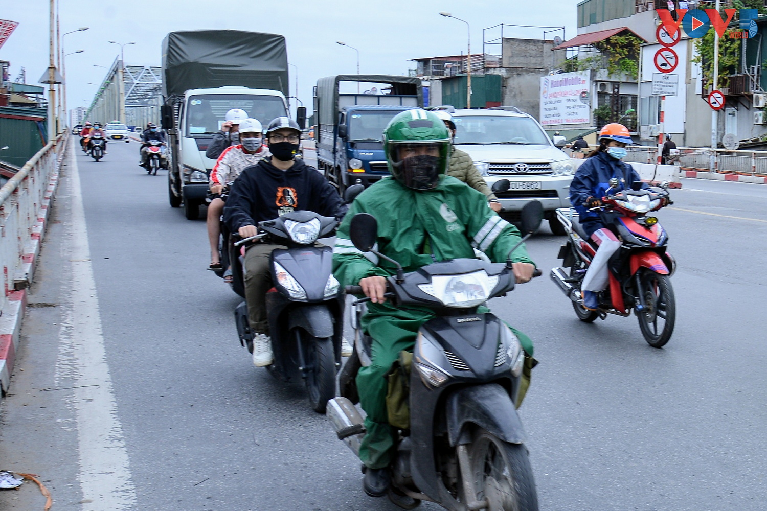 | Người dân đi làm qua cầu Chương Dương vào buổi sáng phải mặc áo khoác dày. |