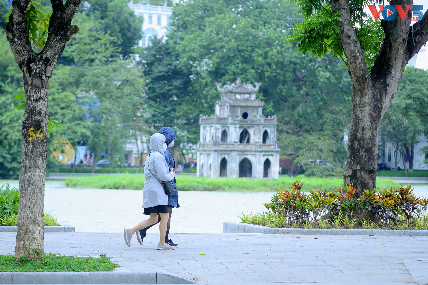 | Một số người đi bộ tận hưởng không khí se lạnh bên bờ hồ Gươm. |