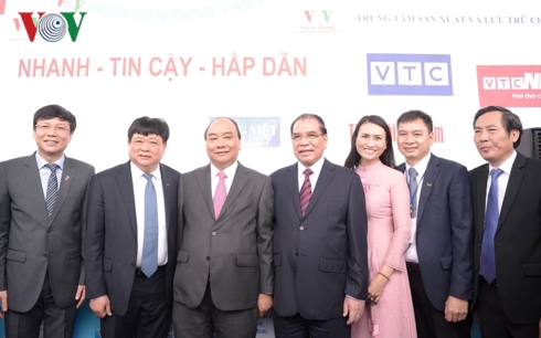Thủ tướng Nguyễn Xuân Phúc, Nguyên Tổng Bí thư Nông Đức Mạnh; Chủ tịch Hội Nhà báo Việt Nam Thuận Hữu; Tổng Giám đốc VOV Nguyễn Thế Kỷ...chụp ảnh lưu niệm tại gian trưng bày của VOV.