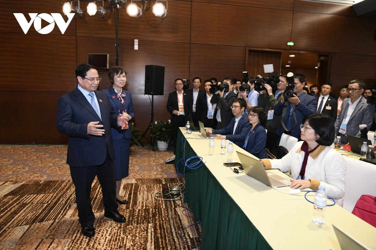 Thủ tướng Phạm Minh Chính ân cần thăm hỏi các phóng viên về điều kiện tác nghiệp, sinh hoạt trong thời gian diễn ra Đại hội lần thứ XIV của Đảng.