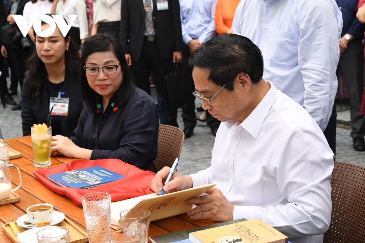 Thủ tướng Phạm Minh Chính tự tay quạt cho hai Phu nhân tại Phố Sách.