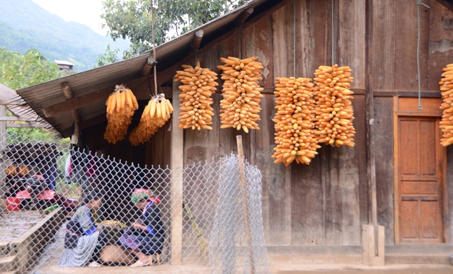 | Một lần đến với Mù Cang Chải sẽ cảm nhận được cuộc sống thanh bình của người dân tộc nơi đây. Lúc rảnh rỗi, phụ nữ ngồi thêu thùa bên mái hiên nhà |