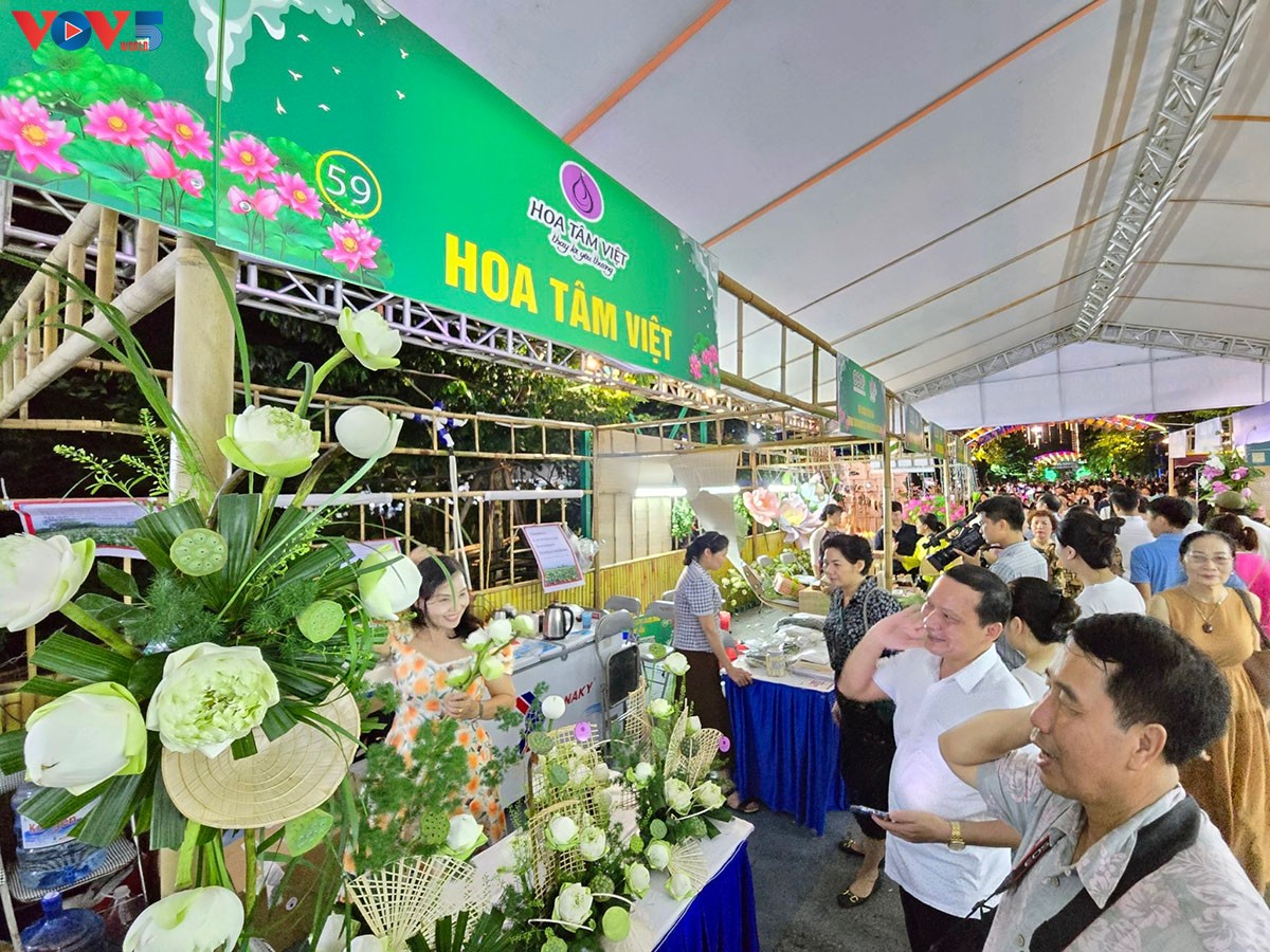 | Điểm nhấn của lễ hội năm nay là các gian hàng về Sen được bài trí và trưng bày sáng tạo thu hút đông đảo người dân tham quan, hưởng ứng. |
