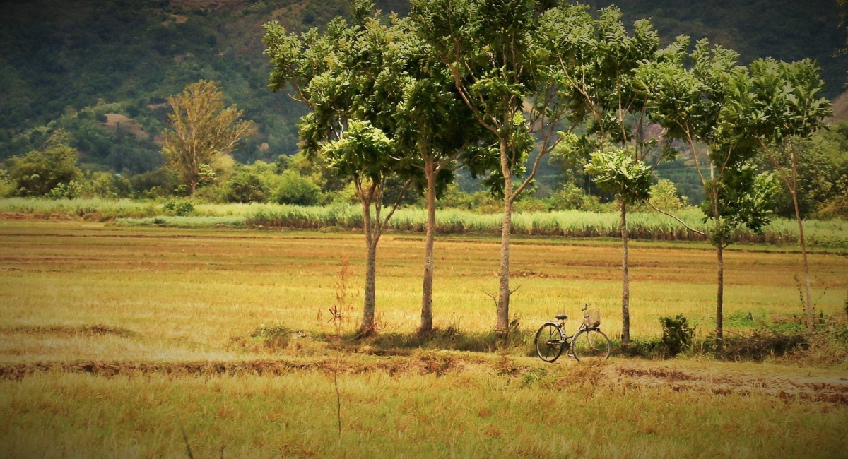Chiếc xe đạp của người đi thăm đồng dựng bên bờ đất dưới hàng cây, ở thôn Thạnh Đức, xã Xuân Quang 3, H.Đồng Xuân. Tiết trời lúc này không thực sự nắng nhưng cũng không râm mát, nói theo phương ngữ Trung bộ là "trời ui ui". Khung cảnh tĩnh lặng, đẹp và buồn.