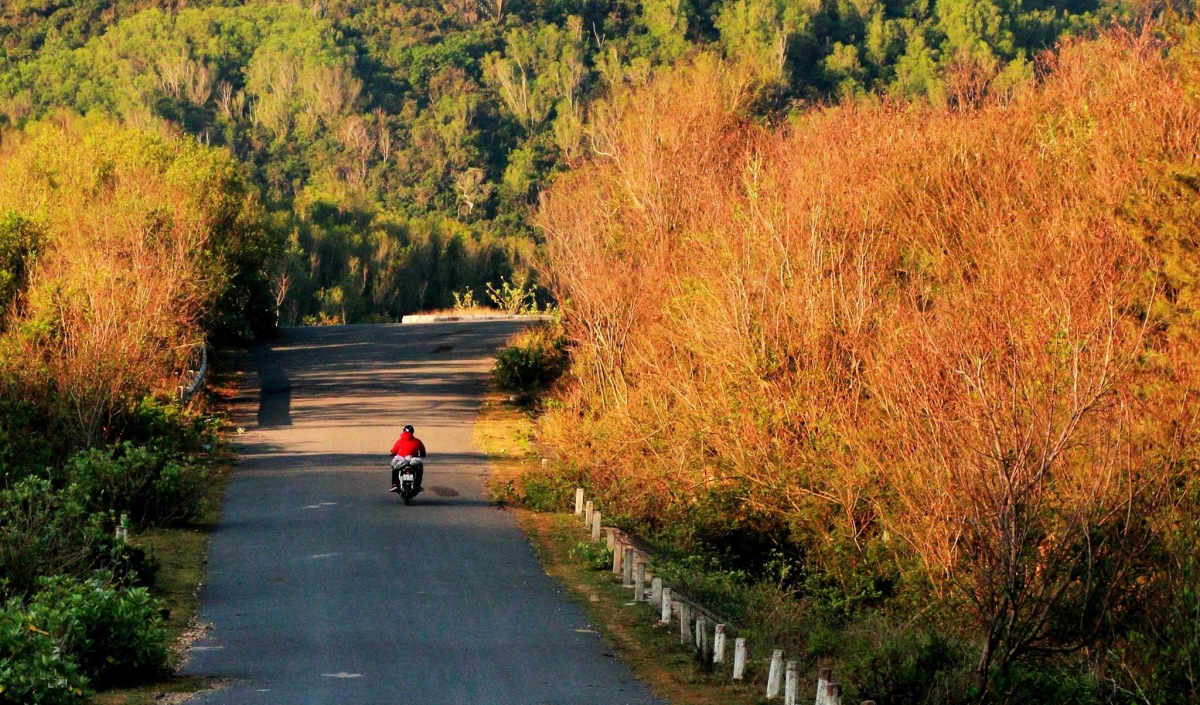 Người đàn ông chạy xe máy trên con đường vào Mũi Điện (xã Hòa Tâm, H.Đông Hòa). Đây được xem là nơi đón ánh nắng mặt trời đầu tiên trên đất liền nước ta. Ánh nắng đầu ngày nhuộm vàng hàng cây hai bên đường tạo ra quang cảnh đẹp mãn nhãn.