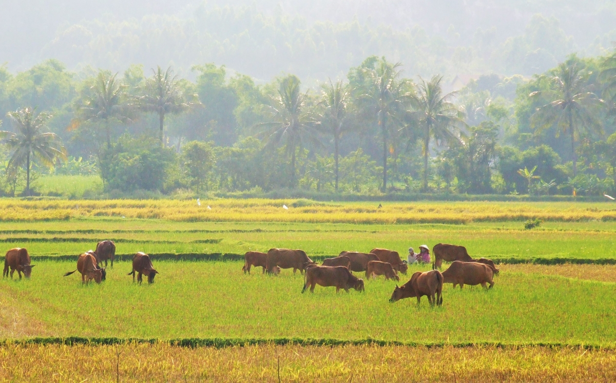 Hai người chận bò (chăn bò) thư thả ngồi canh đàn bò nhẩn nhơ gặm chân rạ sau mùa cắt lúa ở TT.Chí Thạnh, H.Tuy An. Đường QL1 từ Quy Nhơn đi Tuy Hòa qua khu vực này, hai bên là cánh đồng, mùa lúa chín vàng ruộm, nhộn nhịp cảnh thu hoạch, đông đúc những đàn gia súc.