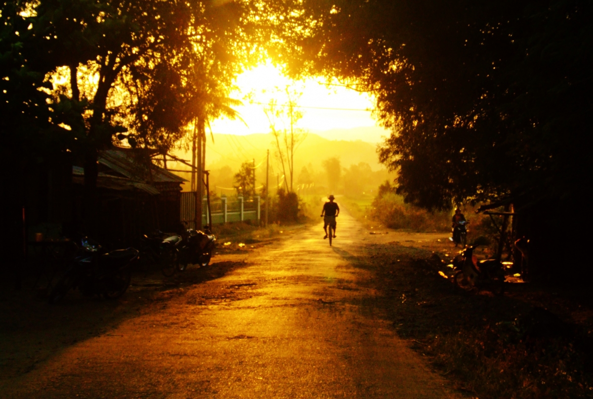 Người đàn ông đạp xe đi thăm đồng về ở H.Đồng Xuân. Thời điểm này nắng chiều hắt lên những tia cuối cùng trong ngày rồi chìm khuất sau dãy núi phía xa. Khung cảnh mộc mạc, bình yên níu chân người.