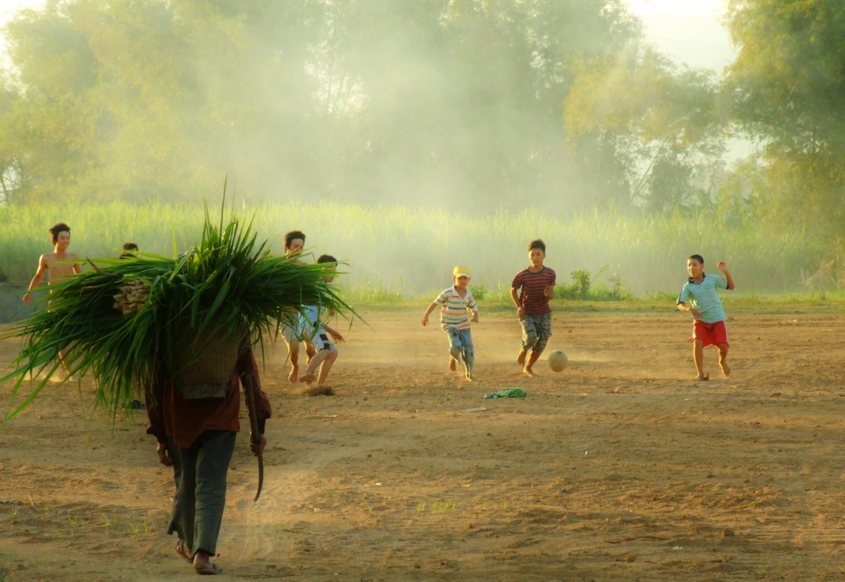 Người đàn ông đi cắt mụt mía (cây mía non) về cho bò ăn, đi ngang qua sân bóng "dã chiến" của nhóm trẻ em trong thôn. Cứ mỗi chiều, sau khi tan lớp hoặc tạm xong việc nhà, nhóm trẻ và cả người lớn ở thôn Phước Lộc, xã Xuân Quang 3, H.Đồng Xuân lại dợt vài trận banh dưới nắng chiều buông.
