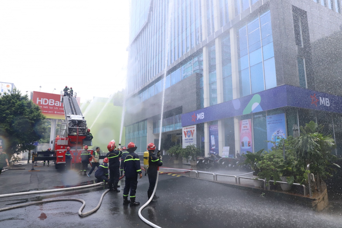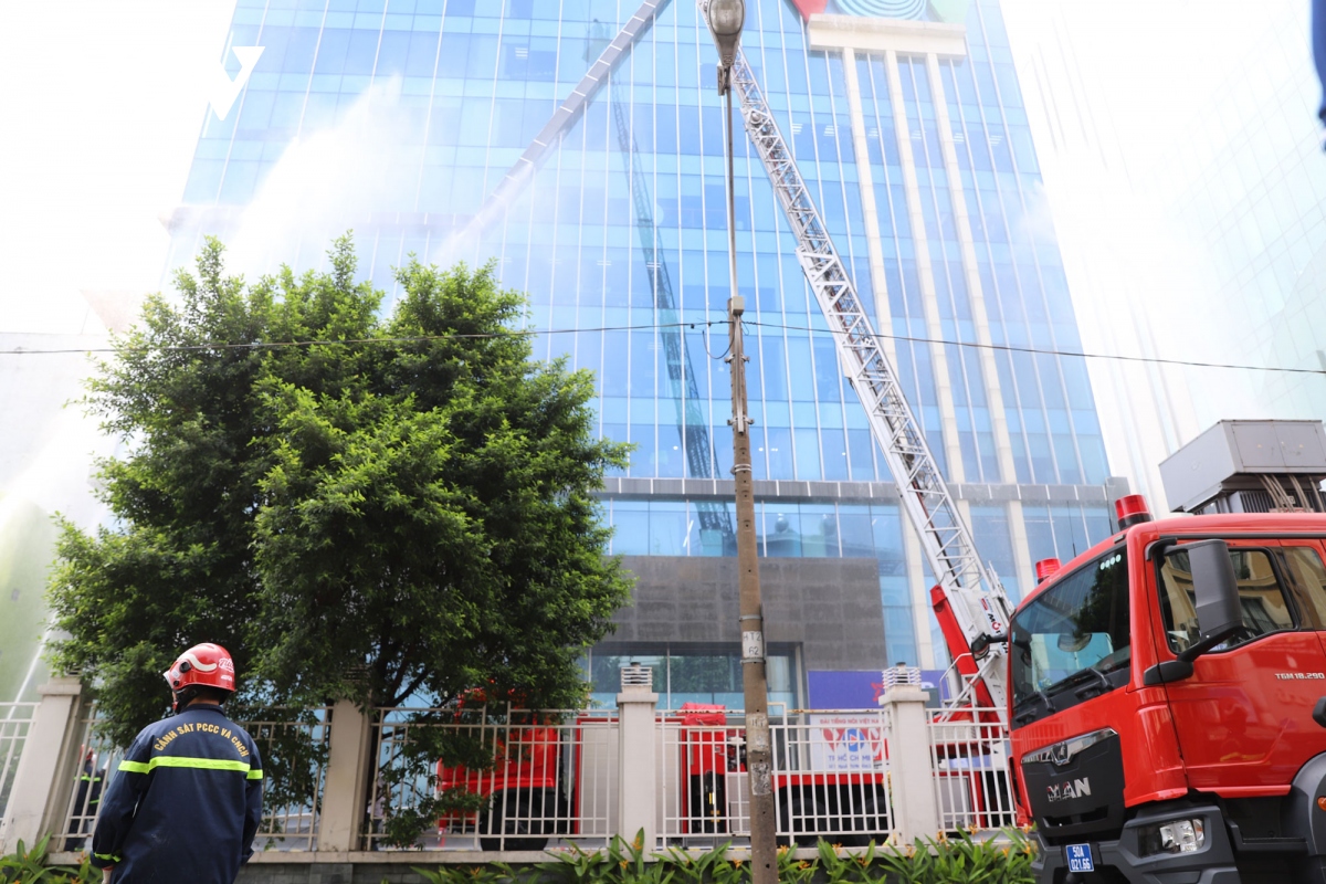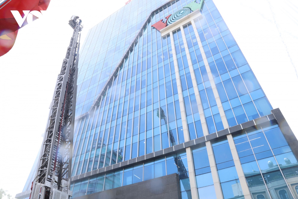 Sử dụng xe thang để chữa cháy trên tầng 15 của tòa nhà VOV |