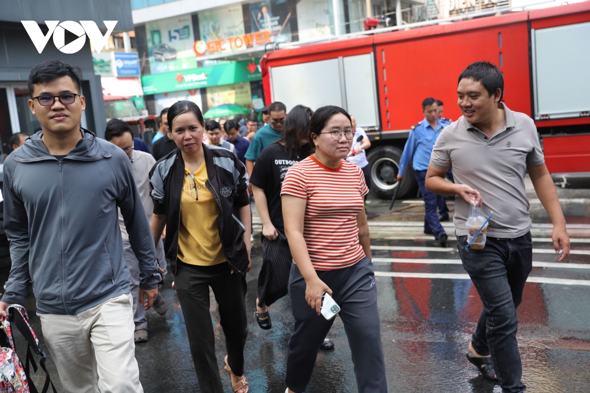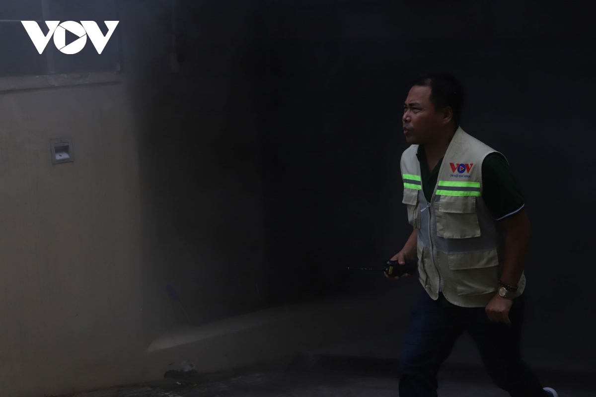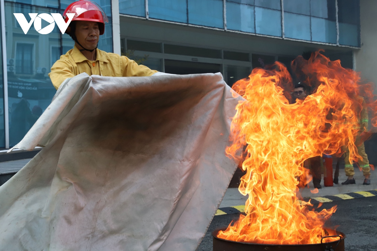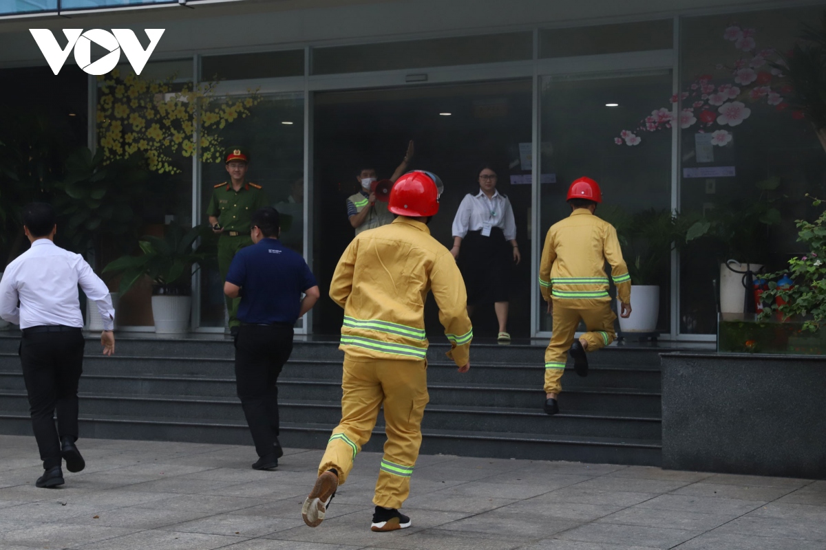 Sử dụng xe thang để chữa cháy trên tầng 15 của tòa nhà VOV |
