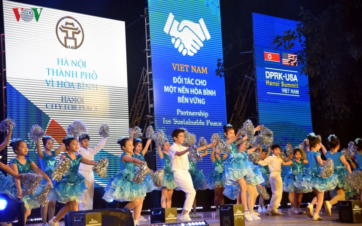 | Tối 26/2, chương trình nghệ thuật mang tên "Đẹp mãi Thăng Long" nhằm chào mừng Thượng đỉnh Mỹ - Triều Tiên lần thứ 2 đã diễn ra tại tượng đài Lý Thái Tổ, trung tâm Hà Nội - thành phố vì hòa bình. |