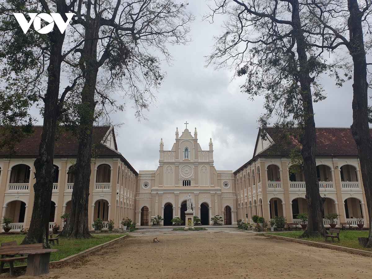 Các nữ tu đang cầu nguyện "Ở đây, đêm Giáng sinh mình tổ chức đêm Canh thức Giáng sinh, mình diễn nguyện lại cuộc giáng thế của Chúa hơn là mình nhắm tới mục đích làm văn nghệ. Đêm này là đêm trọng đại và tất cả những người Kito hữu là phải hợp nhau tới nhà thờ để cử hành mầu nhiệm này" - một nữ tu bày tỏ. Tiểu chủng viện Làng Sông được xây dựng theo kiểu kiến trúc Gothic, lối kiến trúc đặc trưng của người châu Âu trong xây dựng nhà thờ. Phần chính diện của nhà thờ được trang trí bằng những khung ô đối xứng, các bông gió trang trí và những hoa văn họa tiết, cổng vòm nhọn quen thuộc trong lối xây dựng kiến trúc Thánh đường. Xung quanh nhà thờ là cánh đồng lúa ngút tầm mắt. |