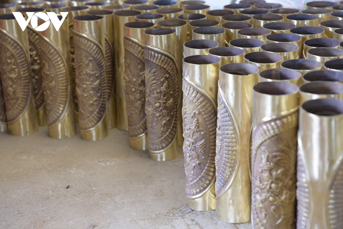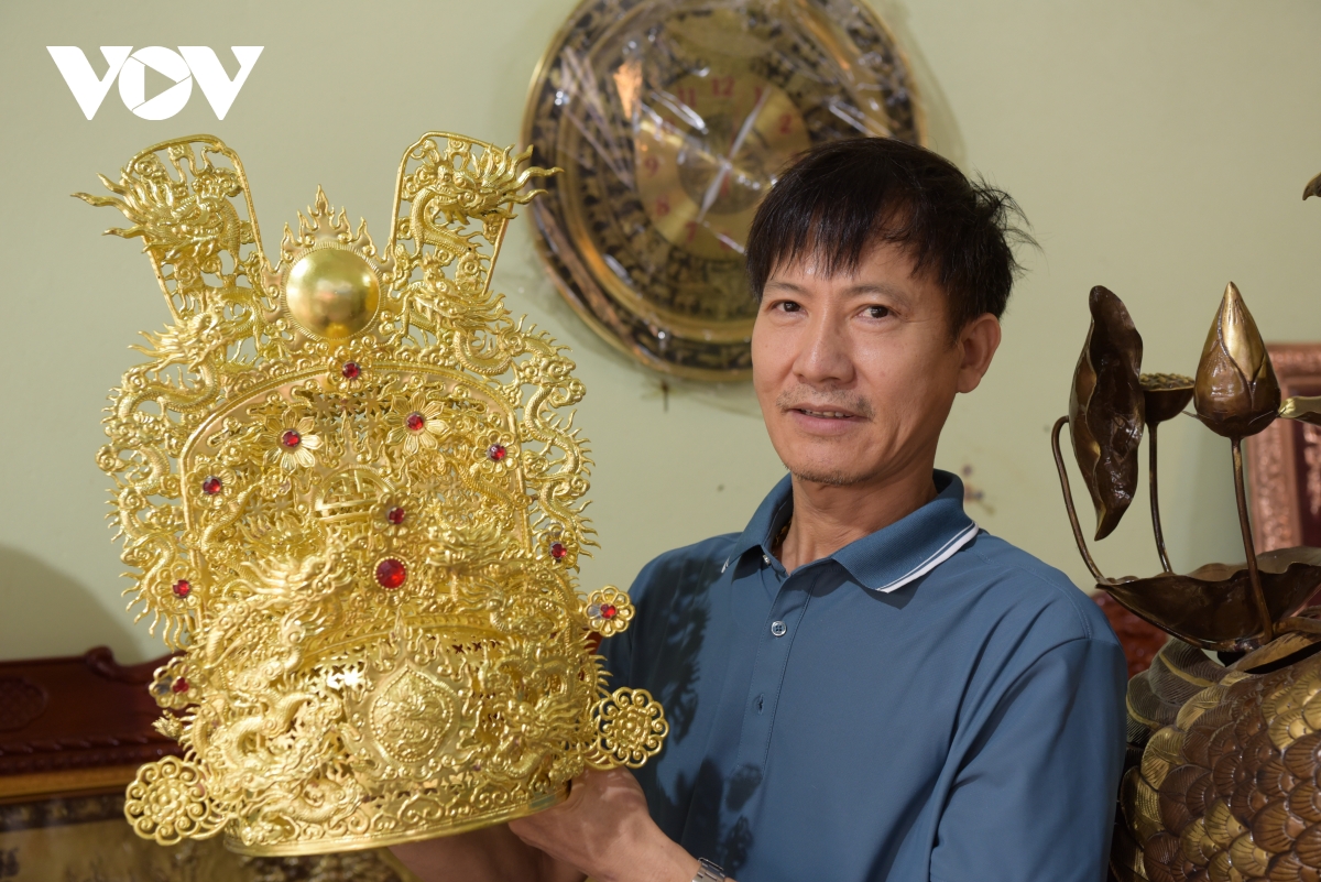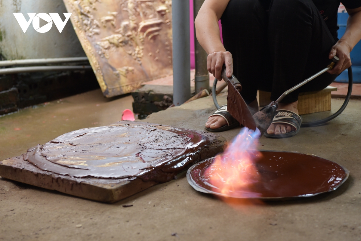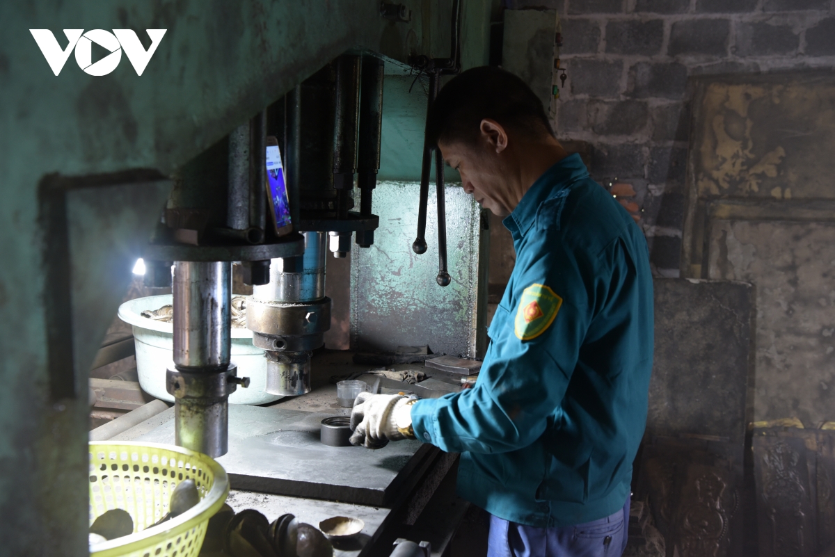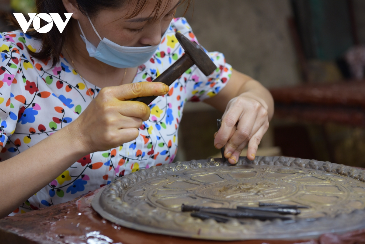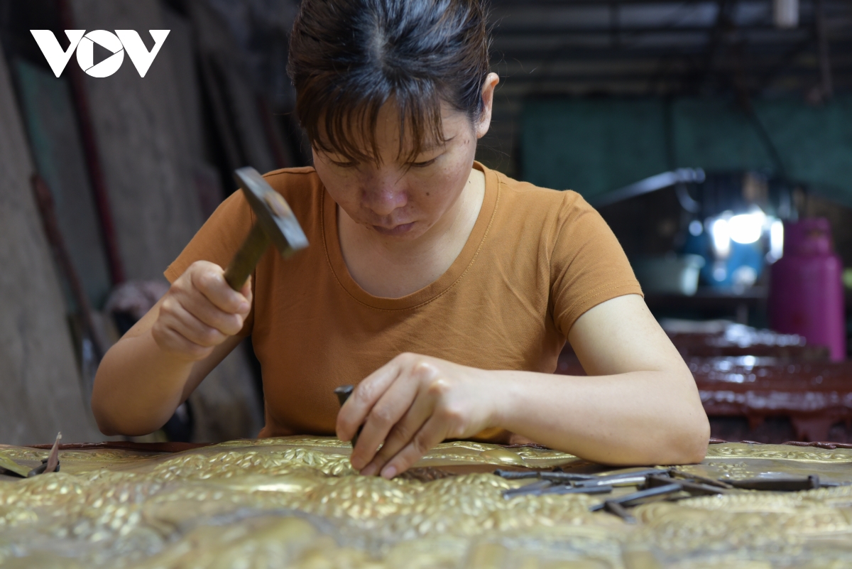 Một hoàn thiện một sản phẩm phải trải qua nhiều công đoạn: Đầu tiên phải cắt đồng, làm khuôn, thúc tay rồi chạm trổ. Khi sản phẩm bóng hơn sẽ mang mài. Trong đó, khó nhất là công đoạn thúc tay để tạo hình khối. Cuối cùng sản phẩm sẽ được mạ đồng.
