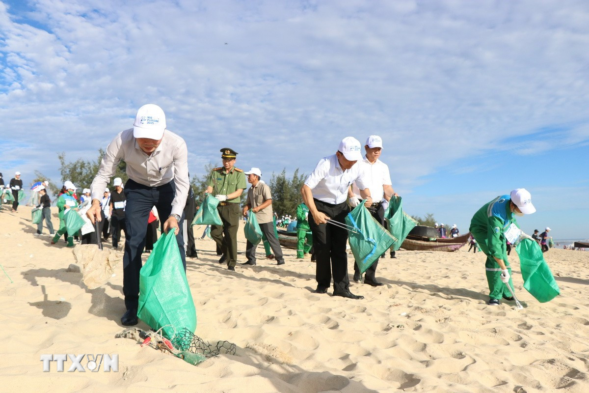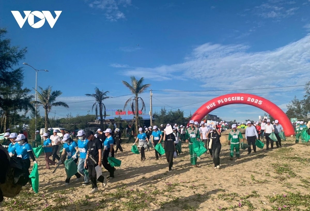 Sáng 1/6, hàng nghìn người dân tham gia sự kiện đi bộ nhặt rác “Hue Plogging 2025” với thông điệp “Dấu chân xanh, biển sạch nhựa” tại các bãi biển trên địa bàn nhiều huyện ở thành phố Huế. Ảnh: Lê Hiếu/VOV |