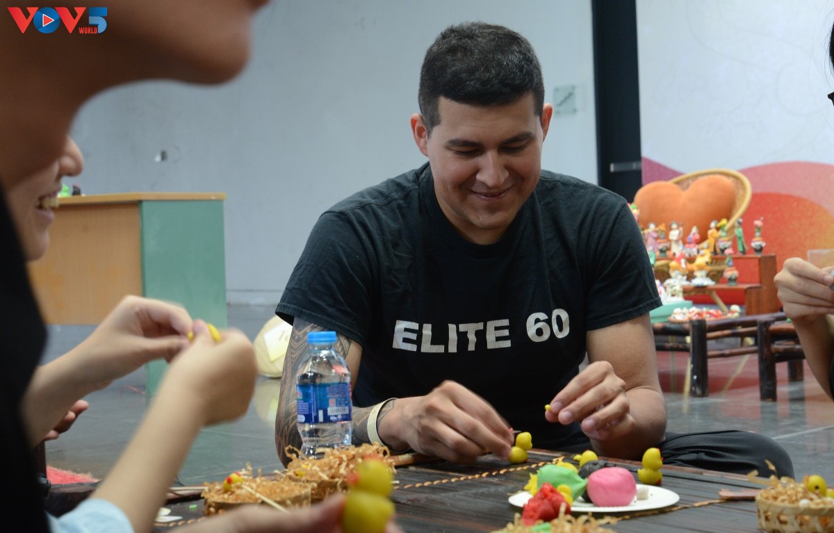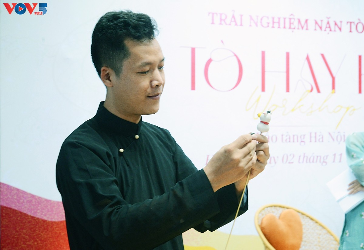 Tham gia chương trình có nghệ nhân Đặng Văn Hậu (bên phải) – người đã hơn 20 năm gắn bó với nghề nặn tò he. |