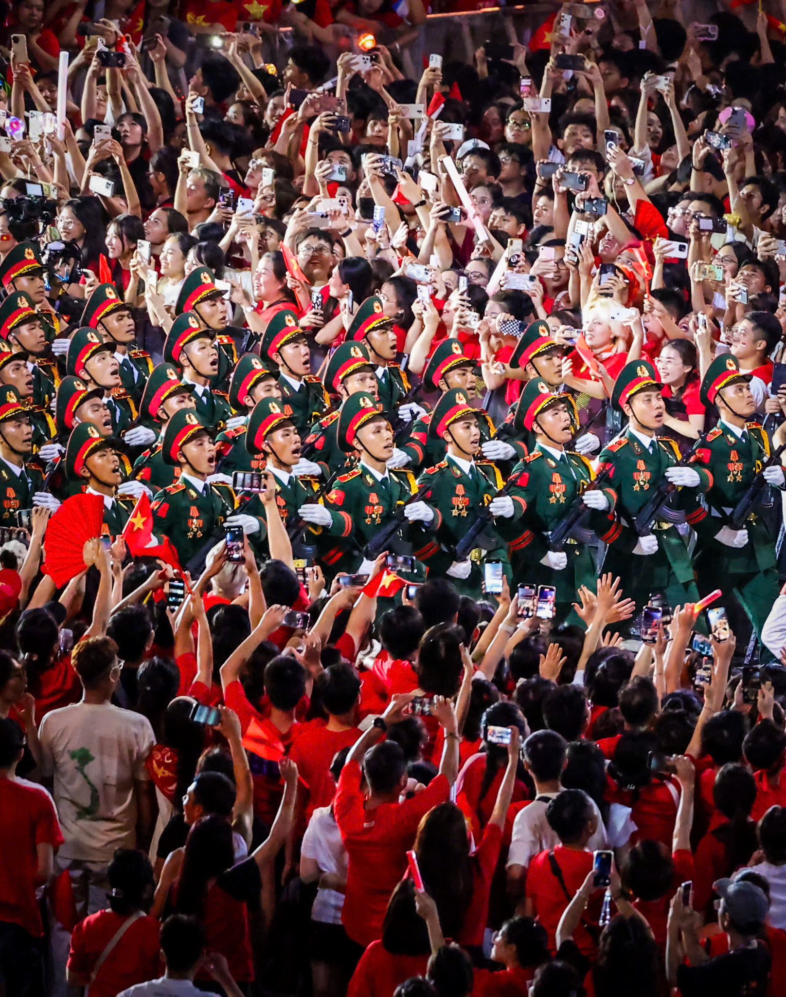| Tiếng nhạc hào hùng của "Tiến quân ca" vang lên, hàng chục nghìn khán giả cùng đồng thanh hát Quốc ca, là khoảnh khắc xúc động nhất của chương trình “Tổ quốc trong tim”. |