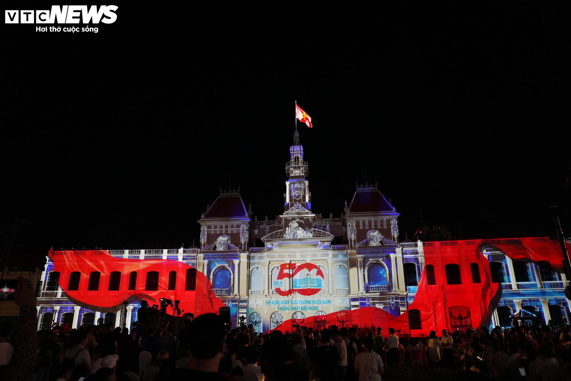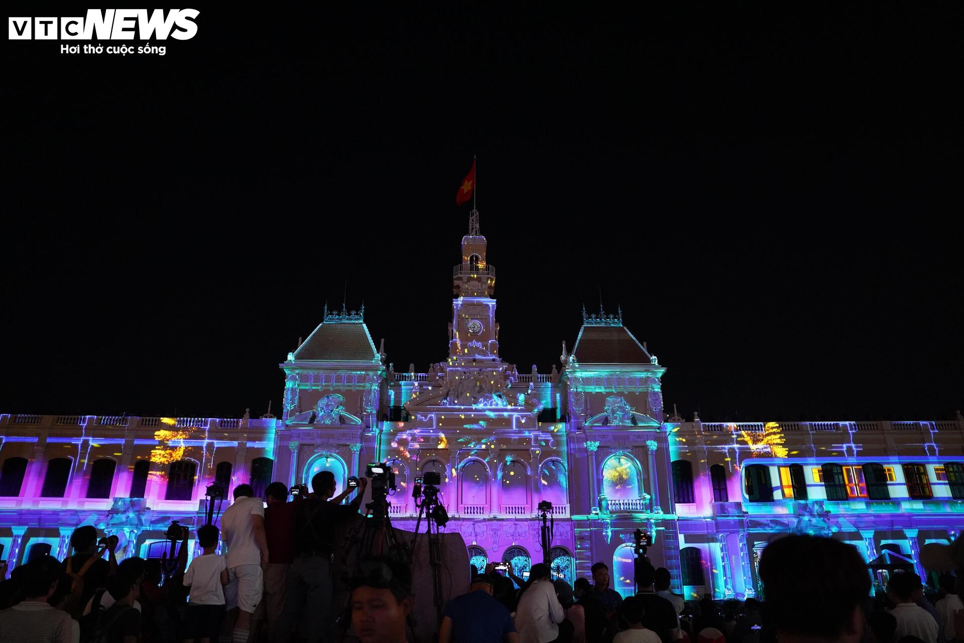 | Toàn bộ mặt tiền của Trụ sở Hội đồng Nhân dân và Ủy ban Nhân dân TP.HCM, công trình kiến trúc mang tính biểu tượng của thành phố, đã trở thành một bức tranh ánh sáng khổng lồ. |