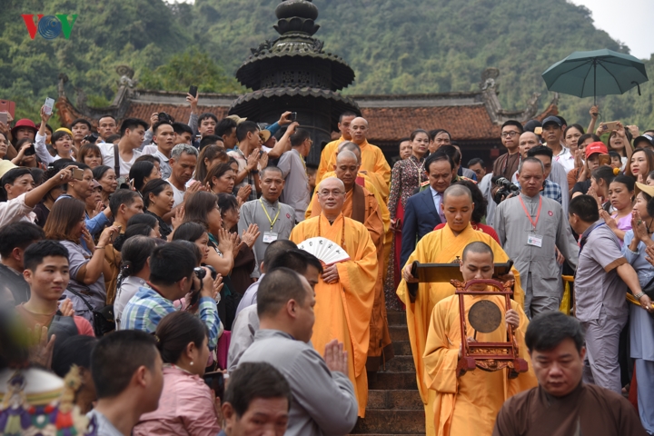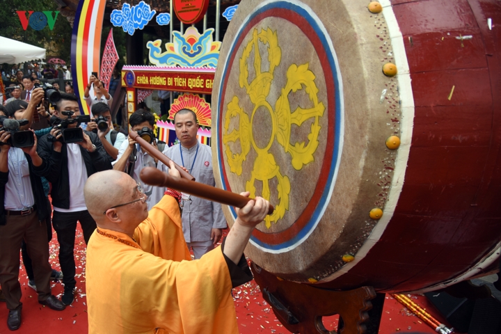 Thượng tọa Thích Minh Hiền đánh trống khai hội Chùa Hương 2019. |