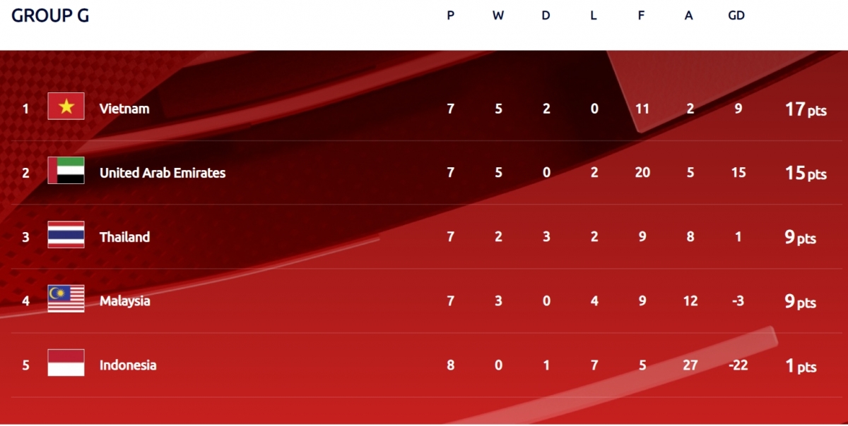 ĐT Việt Nam tiếp tục dẫn đầu bảng G với 2 điểm nhiều hơn UAE và sẽ gặp đối thủ này ở trận lượt cuối vào ngày 15/6 tới. (Ảnh: AFC)