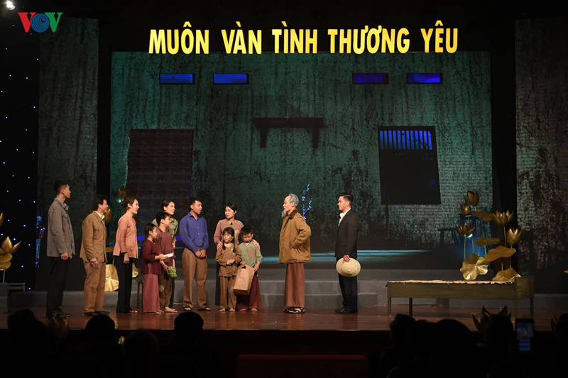 Ngoài các tiết mục âm nhạc, chương trình còn có 3 vở kịch ngắn. Vở kịch “Đêm giao thừa” xây dựng dưới dạng hồi tưởng của bác Vũ Kỳ, thư ký của Chủ tịch Hồ Chí Minh trong một lần Bác đến chúc Tết gia đình chị gánh nước thuê ở Hà Nội vào đêm 30 Tết. (Ảnh: Vũ Toàn)