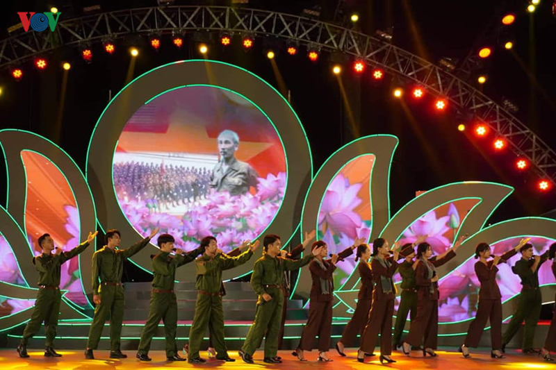Ca sĩ Vũ Thắng Lợi thể hiện ca khúc "50 năm theo lời Bác dặn" (Nhạc: Đức Trịnh; Lời thơ: Nguyễn Thế Kỷ). NSƯT Doãn Nguyên chỉ huy Hợp xướng Đài TNVN, Hợp xướng Học viện Âm nhạc Quốc gia Việt Nam, Dàn nhạc Đài TNVN cùng Vũ đoàn Phương Việt. Ảnh: Vũ Toàn.