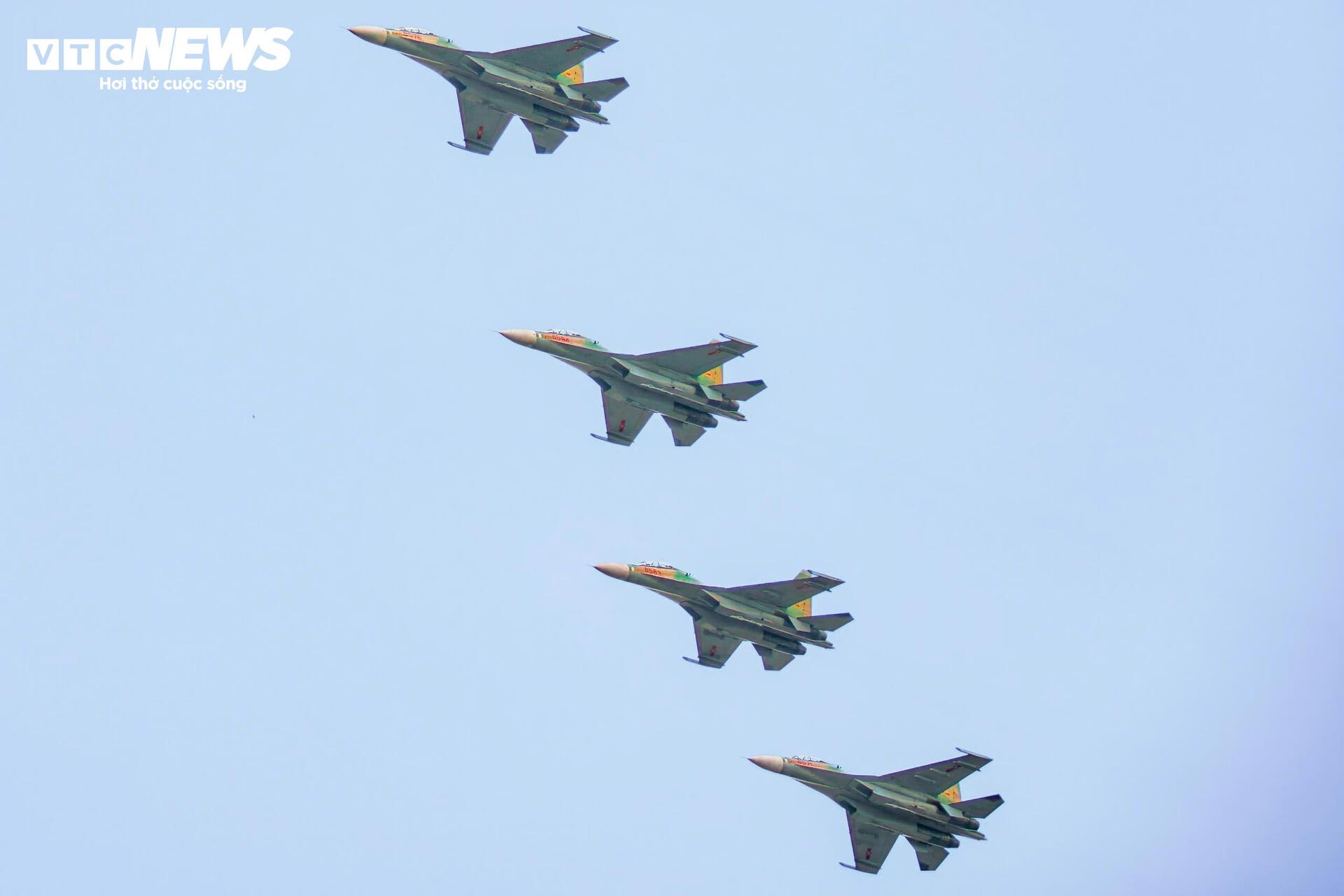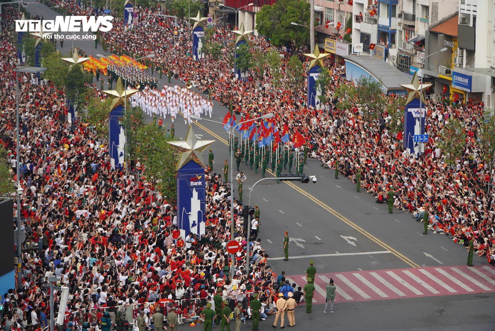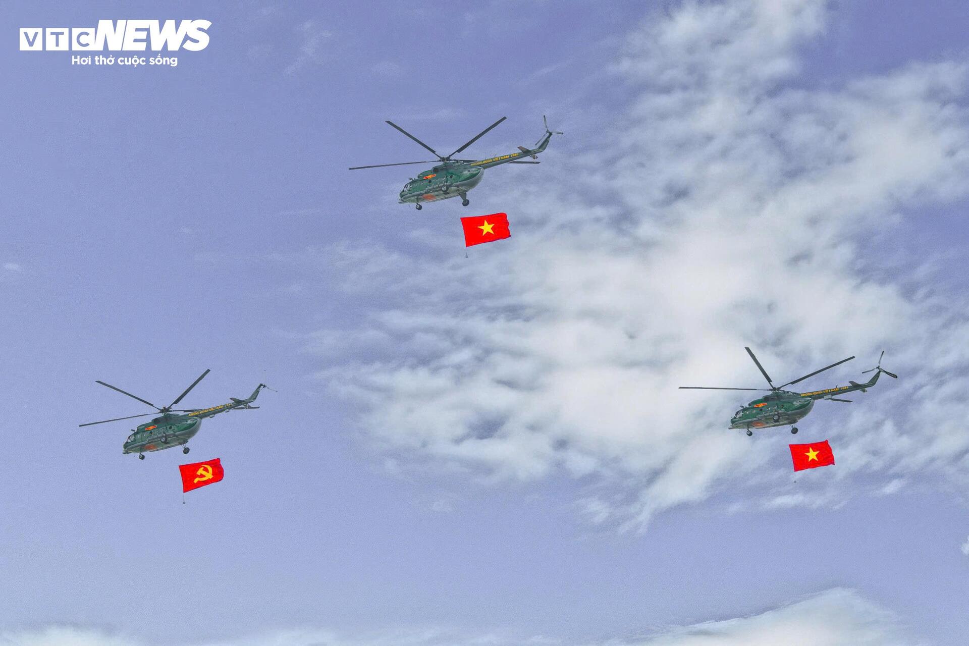 Sau phần nghi lễ, chương trình diễu binh, diễu hành tiếp nối bằng màn biểu diễn của phi đội máy bay trực thăng mang theo cờ Đảng, cờ Tổ quốc cùng phi đội máy bay tiêm kích chiến đấu của Quân đội Nhân dân Việt Nam trên bầu trời trung tâm TP. Hồ Chí Minh. |