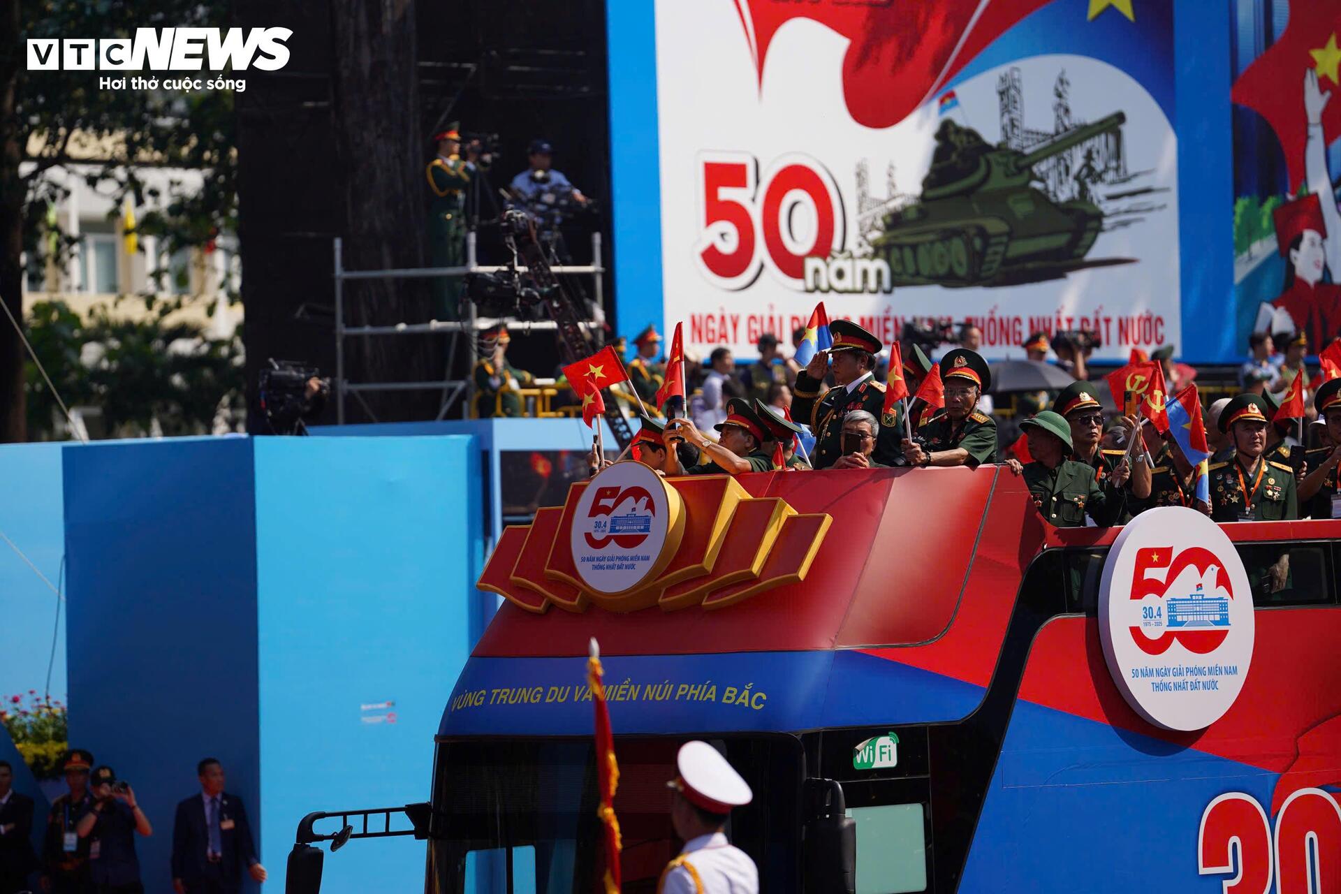 Khối duy nhất của lễ diễu binh, diễu hành được ngồi trên xe bus 2 tầng gồm các Anh hùng Lực lượng vũ trang nhân dân, Anh hùng Lao động và các nhân chứng lịch sử đại diện cho 63 tỉnh, thành. |