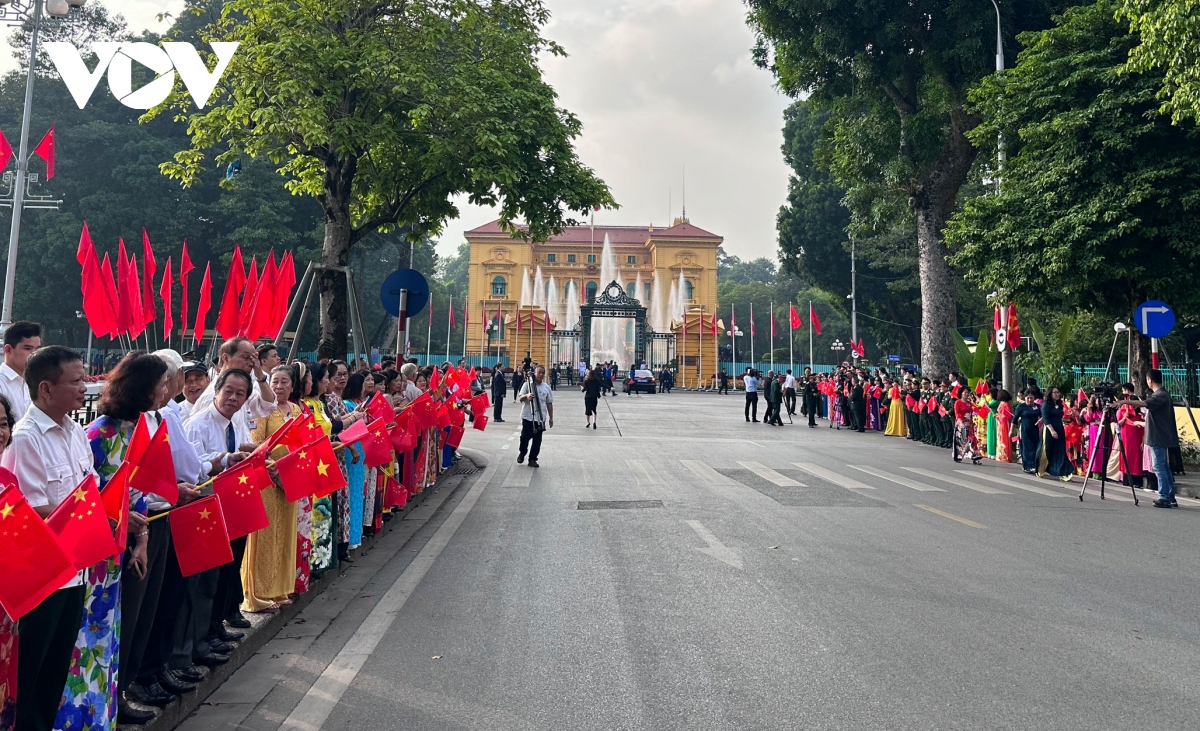 Bên ngoài Phủ Chủ tịch, người dân Hà Nội cầm cờ hai quốc gia đón chào Tổng Bí thư, Chủ tịch Trung Quốc Tập Cận Bình. |