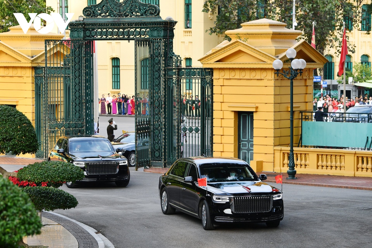 Đúng 16h, đoàn xe chở Tổng Bí thư, Chủ tịch Trung Quốc Tập Cận Bình và Phu nhân cùng đoàn tiến vào Phủ Chủ tịch. |