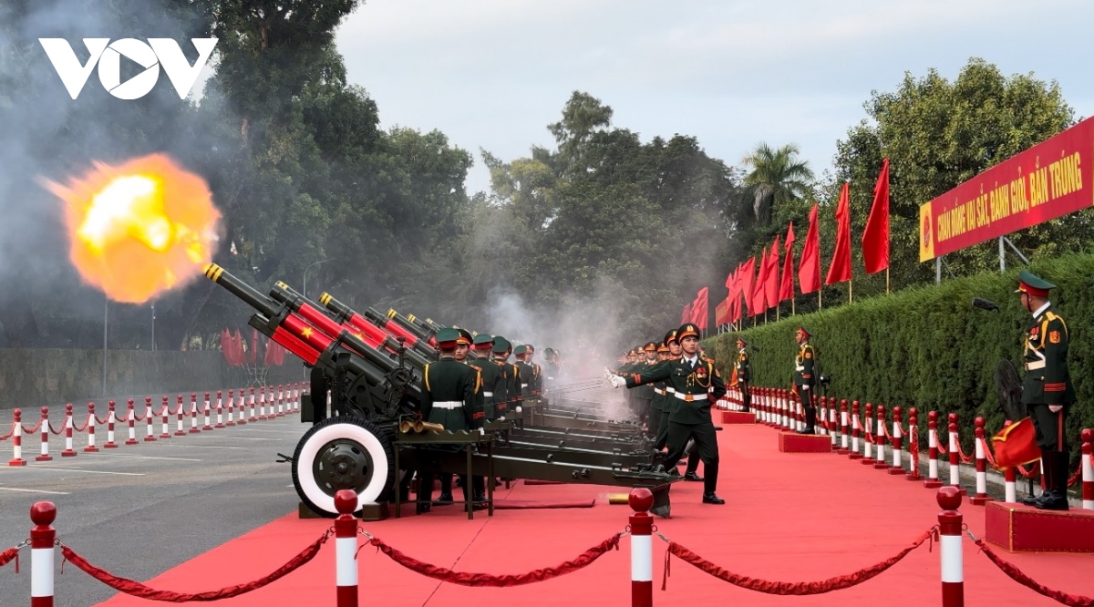 Tại Hoàng thành Thăng Long, 21 loạt đại bác rền vang trong tiếng quốc thiều hùng tráng. |