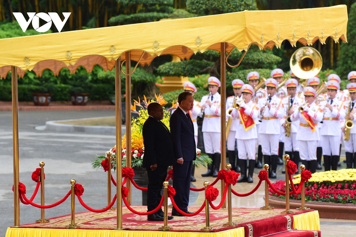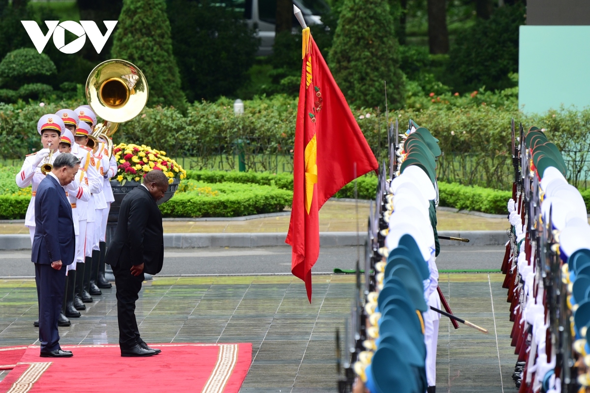 Tổng Bí thư, Chủ tịch nước Tô Lâm mời Tổng thống Filipe Jacinto Nyusi duyệt đội danh dự Quân đội nhân dân Việt Nam. |