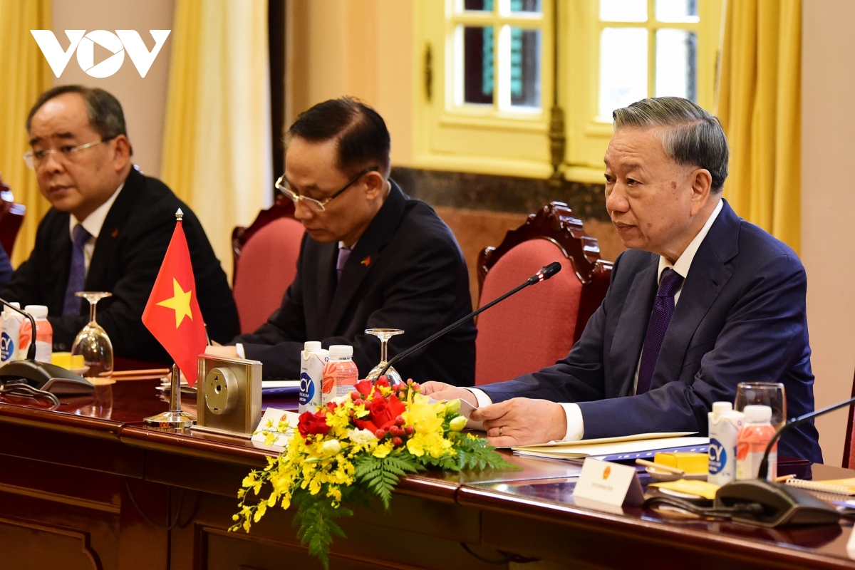 Sau lễ đón đã diễn ra cuộc Gặp hẹp giữa Tổng Bí thư, Chủ tịch nước Tô Lâm và Tổng thống Filipe Jacinto Nyusi, tiếp đó hai bên tiến hành hội đàm. |