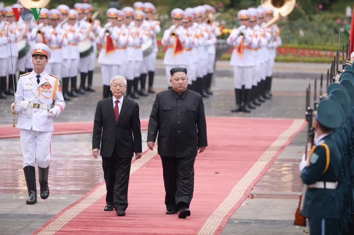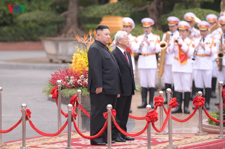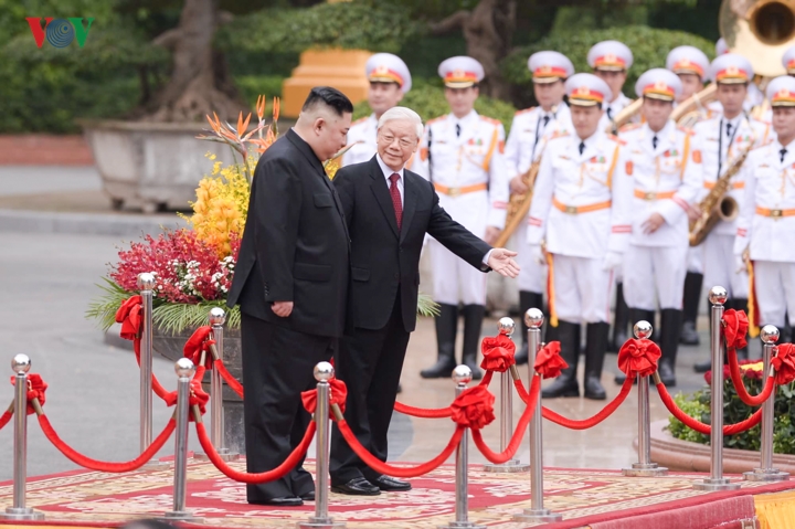 | Tổng Bí thư, Chủ tịch nước Nguyễn Phú Trọng mời Chủ tịch Kim Jong Un duyệt đội danh dự. |