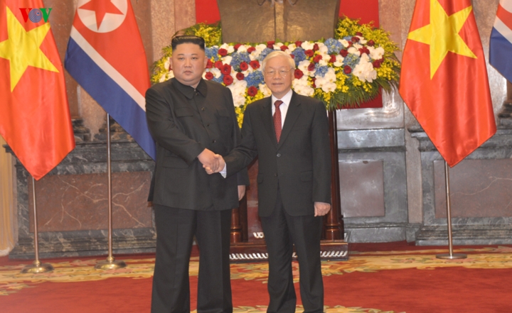| Tổng Bí thư, Chủ tịch nước Nguyễn Phú Trọng bắt tay Chủ tịch Triều Tiên Kim Jong Un (Ảnh: Xuân Dần) |