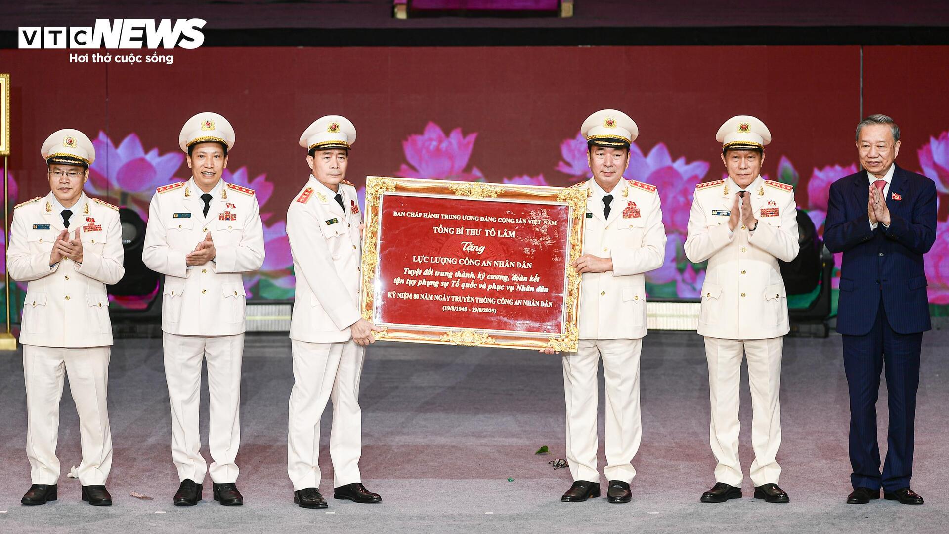 Tổng Bí thư Tô Lâm trao bức trướng tặng lực lượng Công an Nhân dân. |