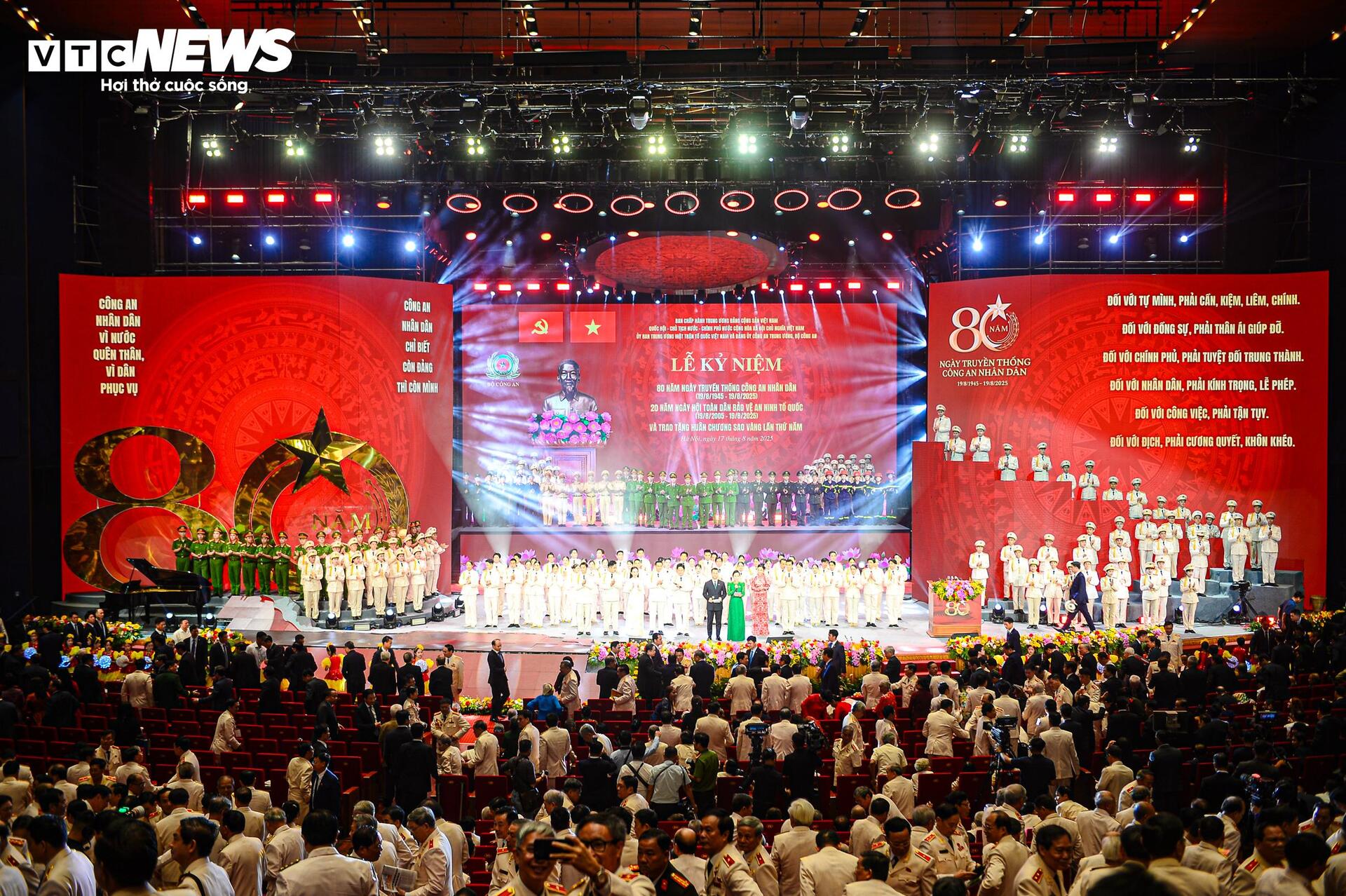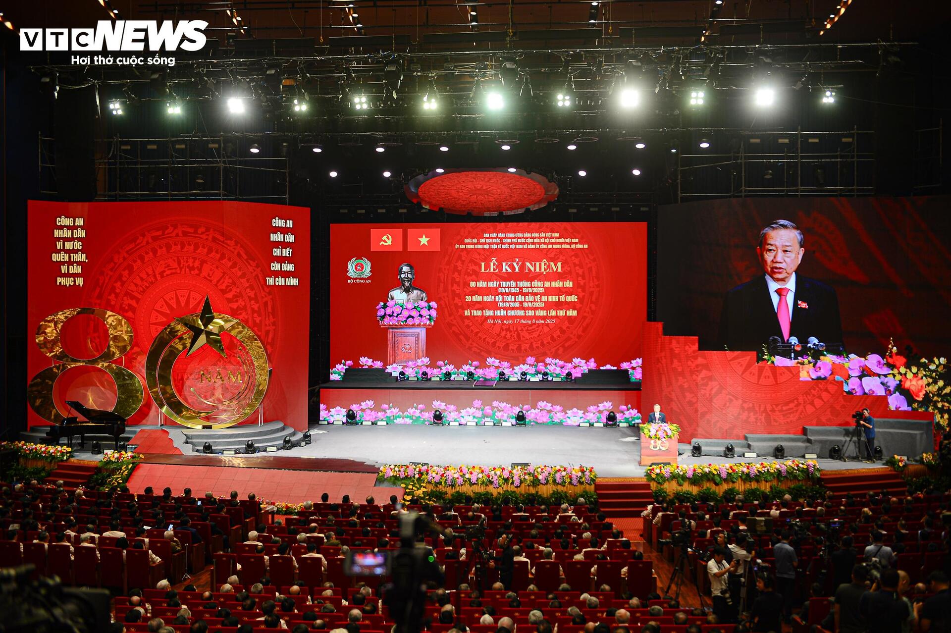 Sáng 17/8, tại Thủ đô Hà Nội, Ban Chấp hành Trung ương Đảng Cộng sản Việt Nam, Quốc hội, Chủ tịch nước, Chính phủ nước Cộng hòa xã hội chủ nghĩa Việt Nam, Ủy ban Trung ương Mặt trận Tổ quốc Việt Nam và Đảng ủy Công an Trung ương - Bộ Công an tổ chức trọng thể Lễ kỷ niệm 80 năm Ngày truyền thống Công an nhân dân (19/8/1945-19/8/2025), 20 năm Ngày hội toàn dân bảo vệ An ninh Tổ quốc (19/8/2005-19/8/2025) và trao tặng Huân chương Sao Vàng lần thứ 5 cho lực lượng Công an nhân dân. |