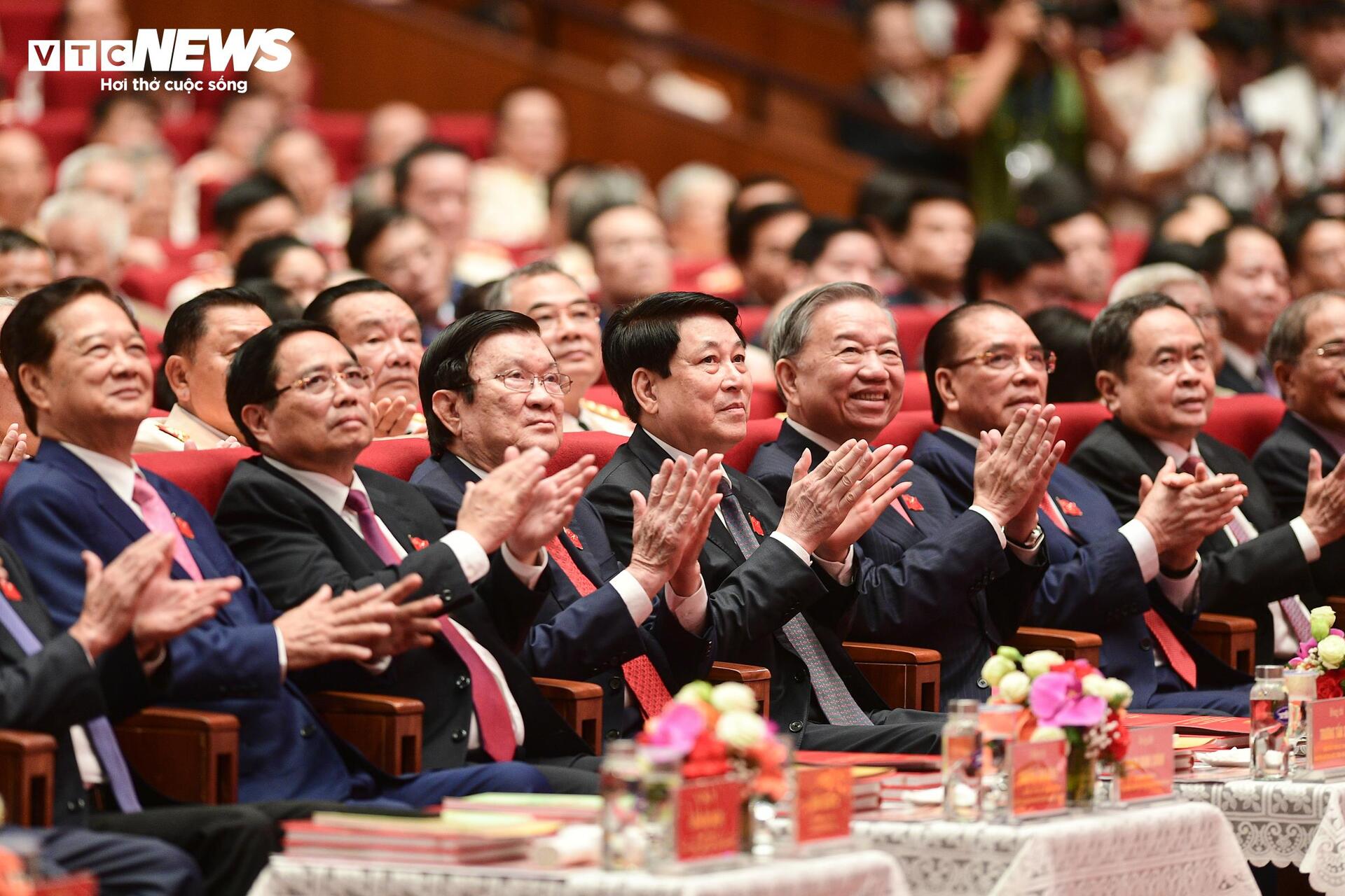 Tổng Bí thư Tô Lâm, Chủ tịch nước Lương Cường, Thủ tướng Phạm Minh Chính, Chủ tịch Quốc hội Trần Thanh Mẫn và các lãnh đạo, nguyên lãnh đạo Đảng, Nhà nước dự Lễ kỷ niệm. |