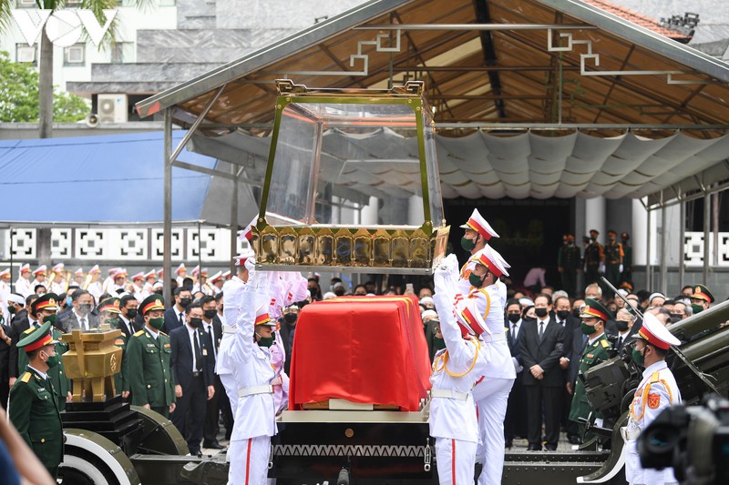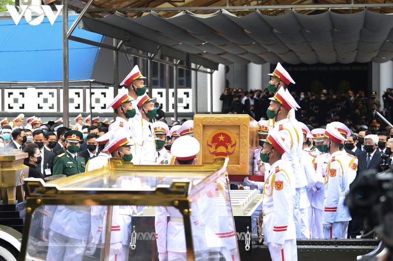 Các vị lãnh đạo, nguyên lãnh đạo Đảng, Nhà nước đi quanh linh cữu nguyên Tổng Bí thư để tiễn biệt ông về nơi an nghỉ cuối cùng.