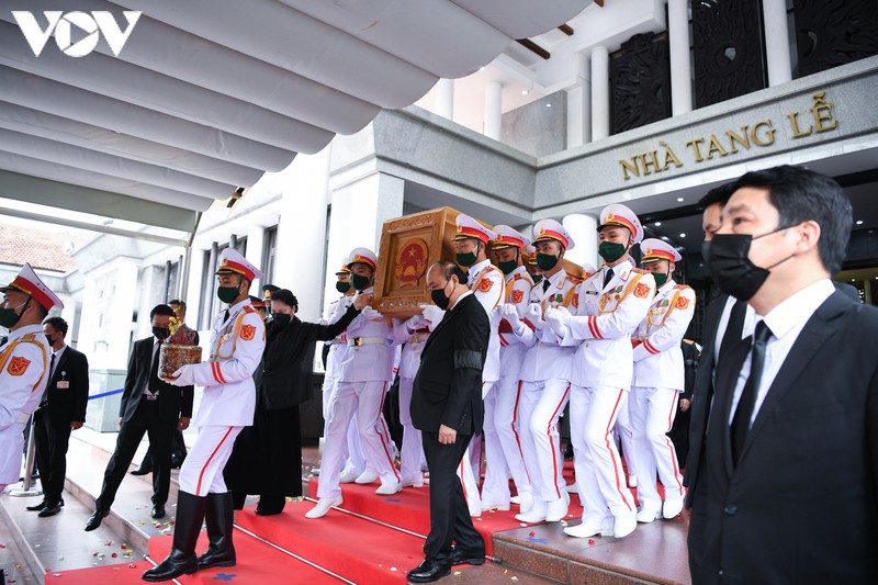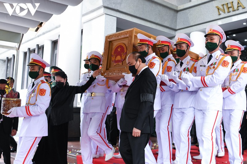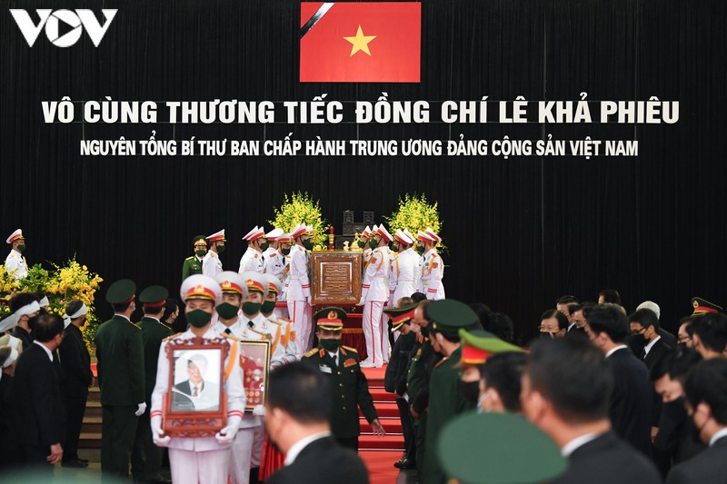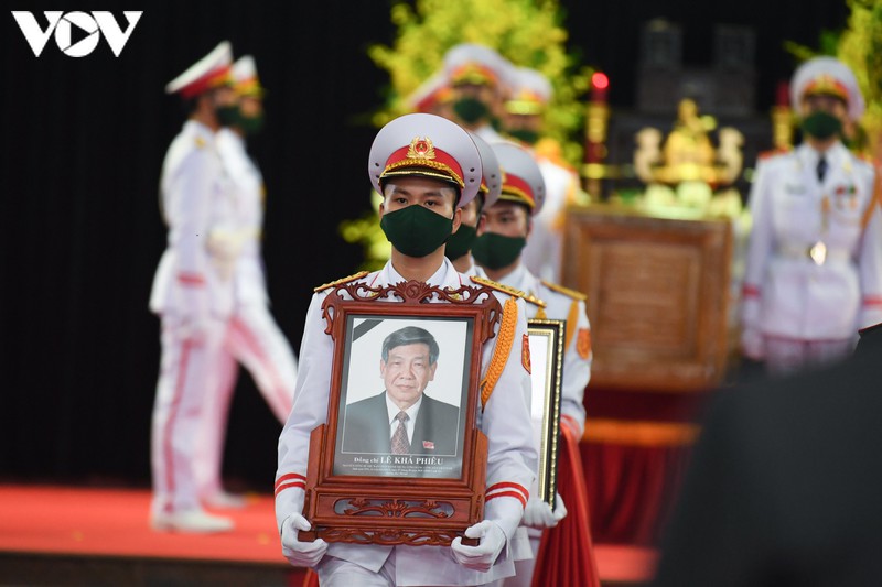 Linh cữu nguyên Tổng Bí thư Lê Khả Phiêu được di chuyển ra ngoài nhà tang lễ. Thủ tướng Nguyễn Xuân Phúc và Chủ tịch Quốc hội Nguyễn Thị Kim Ngân đứng hai bên cùng nâng linh cữu di chuyển ra cỗ linh xa.